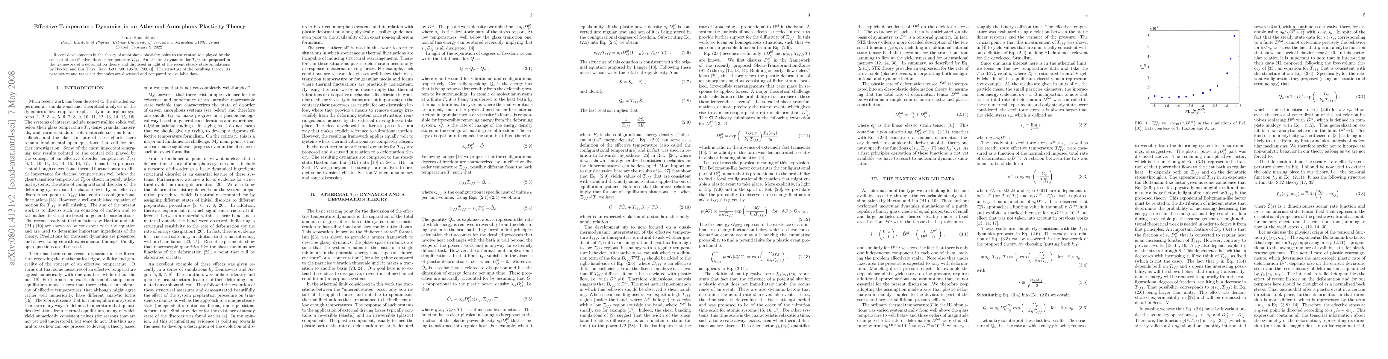 Recent developments in the theory of amorphous plasticity point to the central role played by the concept of an effective disorder temperature $T_{eff}$. An athermal dynamics for $T_{eff}$ are proposed in the framework of a deformation theory and discussed in light of the recent steady state simulations by Haxton and Liu [Phys. Rev. Lett. {\bf 99}, 195701 (2007)]. The structure of the resulting theory, its parameters and transient dynamics are discussed and compared to available data.