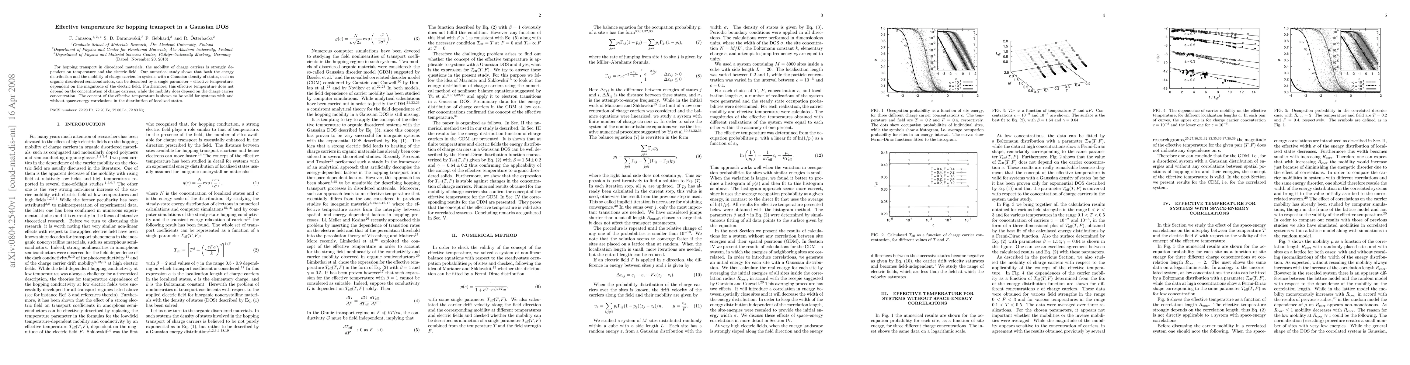 This paper investigates hopping transport in disordered materials with a Gaussian density of states, demonstrating that a single effective temperature parameter, dependent on electric field strength, governs both energy distribution and carrier mobility. The effective temperature is independent of charge carrier concentration, while mobility is not.