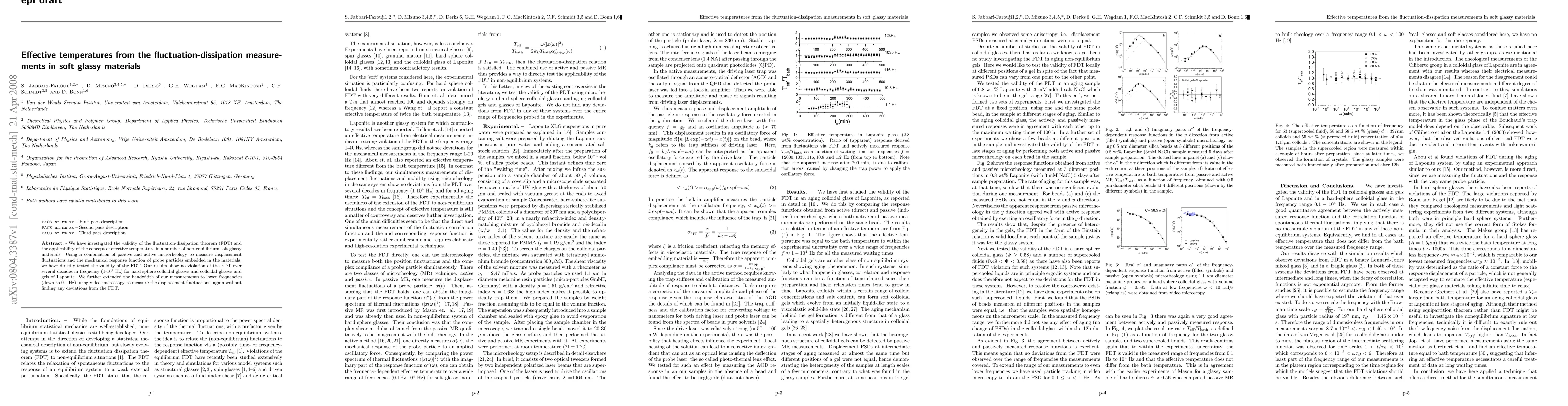 We have investigated the validity of the fluctuation-dissipation theorem (FDT) and the applicability of the concept of effective temperature in a number of non-equilibrium soft glassy materials. Using a combination of passive and active microrheology to measure displacement fluctuations and the mechanical response function of probe particles embedded in the materials, we have directly tested the validity of the FDT. Our results show no violation of the FDT over several decades in frequency (1-10$^4$ Hz) for hard sphere colloidal glasses and colloidal glasses and gels of Laponite. We further extended the bandwidth of our measurements to lower frequencies (down to 0.1 Hz) using video microscopy to measure the displacement fluctuations, again without finding any deviations from the FDT.
