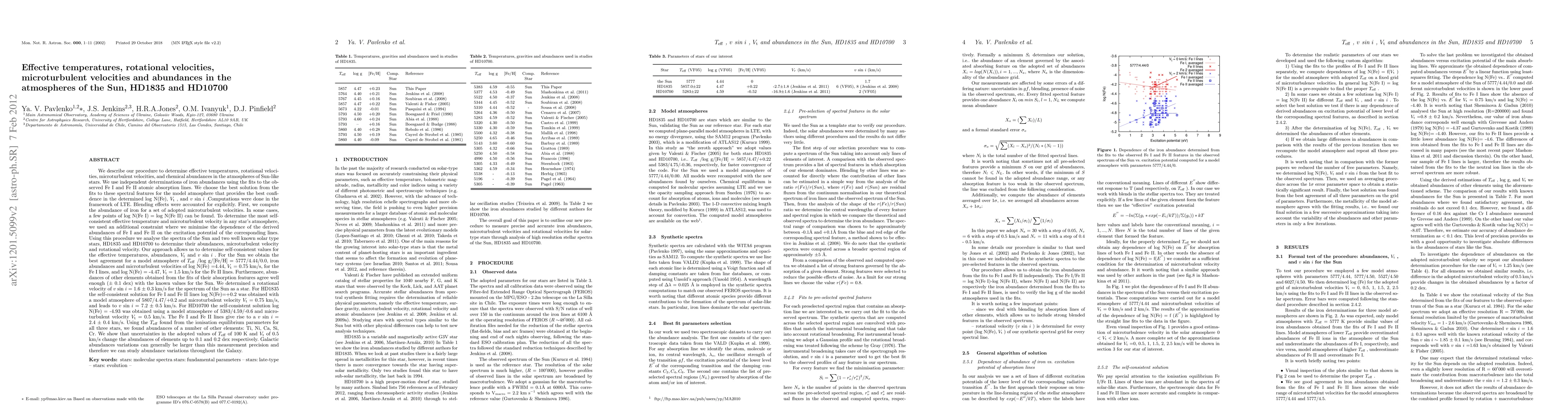 We describe our procedure to determine effective temperatures, rotational velocities, microturbulent velocities, and chemical abundances in the atmospheres of Sun-like stars. We use independent determinations of iron abundances using the fits to the observed Fe I and Fe II atomic absorption lines. We choose the best solution from the fits to these spectral features for the model atmosphere that provides the best confidence in the determined log N(Fe), Vt, and vsini. First, we compute the abundance of iron for a set of adopted microturbulent velocities. To determine the most self-consistent effective temperature and microturbulent velocity in any star's atmosphere, we used an additional constraint where we minimise the dependence of the derived abundances of Fe I and Fe II on the excitation potential of the corresponding lines. We analyse the spectra of the Sun and two well known solar type stars, HD1835 and HD10700 to determine their abundances, microturbulent velocity and rotational velocity. For the Sun abundances of elements obtained from the fits of their absorption features agree well enough (+/- 0.1 dex) with the known values for the Sun. We determined a rotational velocity of vsini = 1.6 +/- 0.3 km/s for the spectrum of the Sun as a star. For HD1835 the self-consistent solution for Fe I and Fe II lines log N(Fe)=+0.2 was obtained with a model atmosphere of 5807/4.47/+0.2 andmicroturbulent velocity Vt = 0.75 km/s, and leads to vsini = 7.2 $\pm$ 0.5 km/s. For HD10700 the self-consistent solution log N(Fe) = -4.93 was obtained using a model atmosphere of 5383/4.59/-0.6and microturbulent velocity Vt = 0.5 km/s. The Fe I and Fe II lines give rise to a vsini = 2.4 +/- 0.4 km/s. Using the Teff found from the ionisation equilibrium parameters for all three stars, we found abundances of a number of other elements: Ti, Ni, Ca, Si, Cr. ... Abriged.