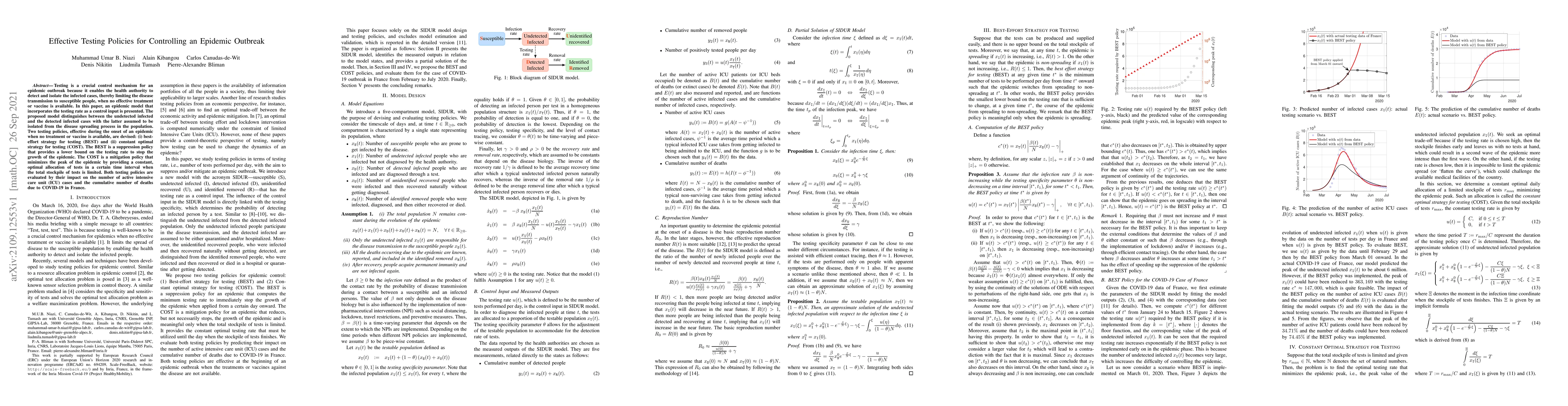 This paper presents an epidemic model incorporating testing as a control input to limit disease transmission. It proposes two testing policies: BEST, which suppresses the epidemic, and COST, which mitigates the peak by optimally allocating tests. The effectiveness of these policies is evaluated based on ICU cases and cumulative deaths in France during COVID-19.