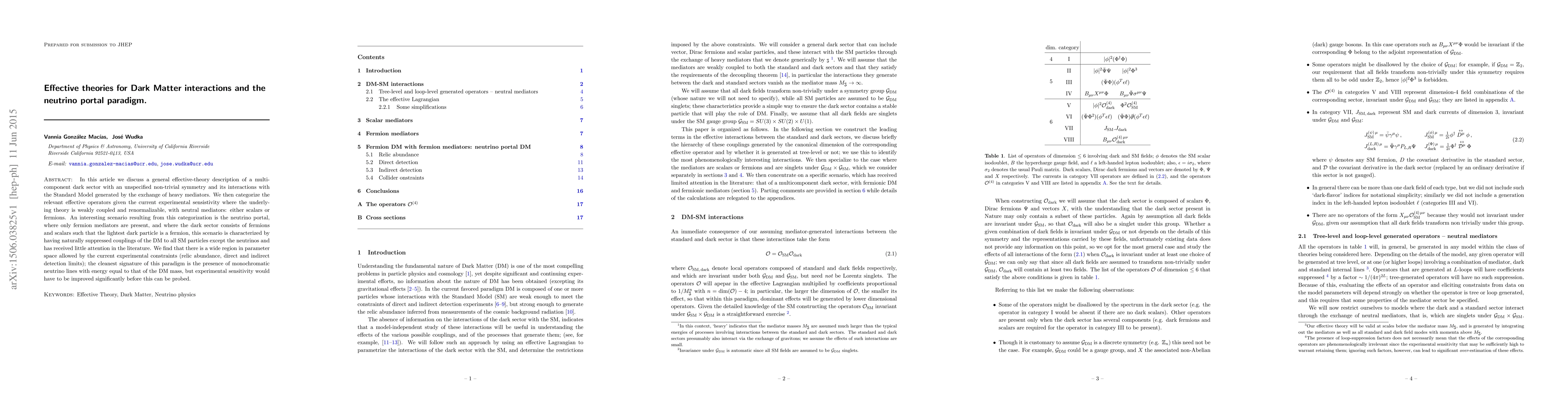 In this article we discuss a general effective-theory description of a multi-component dark sector with an unspecified non-trivial symmetry and its interactions with the Standard Model generated by the exchange of heavy mediators. We then categorize the relevant effective operators given the current experimental sensistivity where the underlying theory is weakly coupled and renormalizable, with neutral mediators: either scalars or fermions. An interesting scenario resulting from this categorization is the neutrino portal, where only fermion mediators are present, and where the dark sector consists of fermions and scalars such that the lightest dark particle is a fermion, this scenario is characterized by having naturally suppressed couplings of the DM to all SM particles except the neutrinos and has received little attention in the literature. We find that there is a wide region in parameter space allowed by the current experimental constraints (relic abundance, direct and indirect detection limits); the cleanest signature of this paradigm is the presence of monochromatic neutrino lines with energy equal to that of the DM mass, but experimental sensitivity would have to be improved significantly before this can be probed.