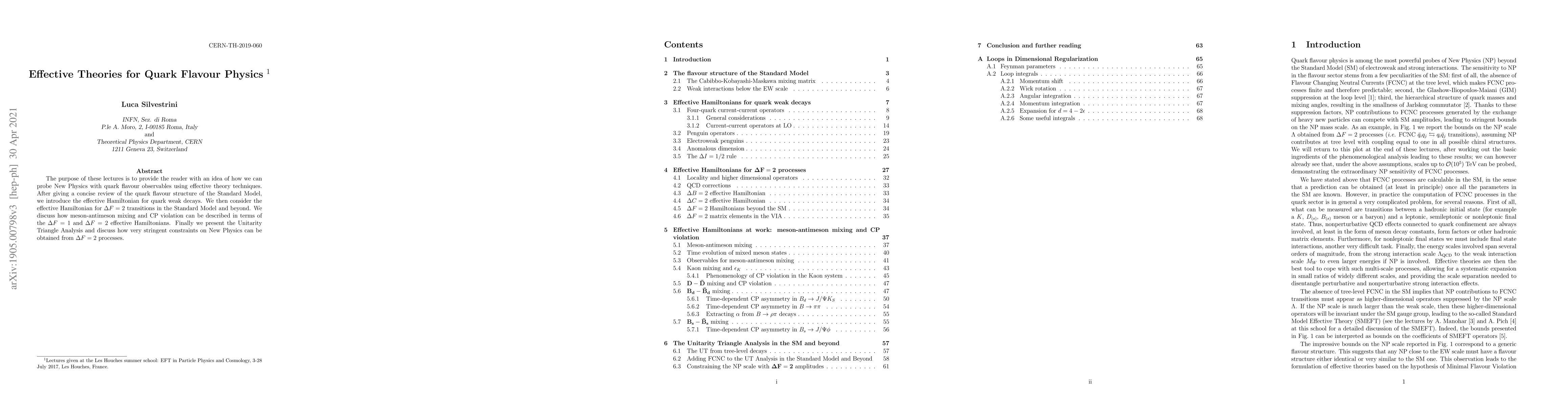 The purpose of these lectures is to provide the reader with an idea of how we can probe New Physics with quark flavour observables using effective theory techniques. After giving a concise review of the quark flavour structure of the Standard Model, we introduce the effective Hamiltonian for quark weak decays. We then consider the effective Hamiltonian for $\Delta F=2$ transitions in the Standard Model and beyond. We discuss how meson-antimeson mixing and CP violation can be described in terms of the $\Delta F=1$ and $\Delta F=2$ effective Hamiltonians. Finally we present the Unitarity Triangle Analysis and discuss how very stringent constraints on New Physics can be obtained from $\Delta F=2$ processes.
