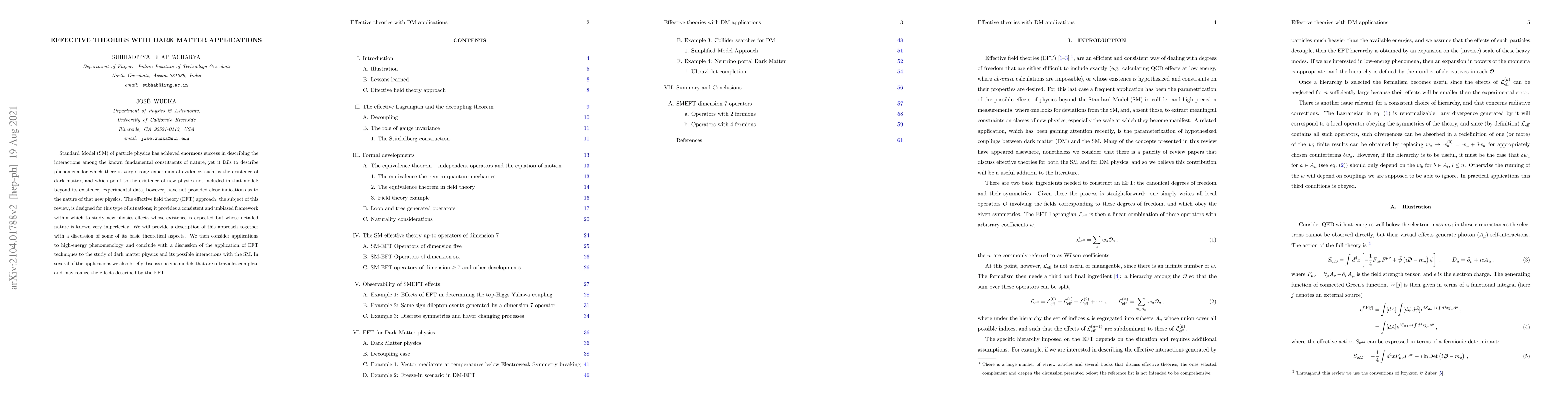 Standard Model (SM) of particle physics has achieved enormous success in describing the interactions among the known fundamental constituents of nature, yet it fails to describe phenomena for which there is very strong experimental evidence, such as the existence of dark matter, and which point to the existence of new physics not included in that model; beyond its existence, experimental data, however, have not provided clear indications as to the nature of that new physics. The effective field theory (EFT) approach, the subject of this review, is designed for this type of situations; it provides a consistent and unbiased framework within which to study new physics effects whose existence is expected but whose detailed nature is known very imperfectly. We will provide a description of this approach together with a discussion of some of its basic theoretical aspects. We then consider applications to high-energy phenomenology and conclude with a discussion of the application of EFT techniques to the study of dark matter physics and it possible interactions with the SM. In several of the applications we also briefly discuss specific models that are ultraviolet complete and may realize the effects described by the EFT.
