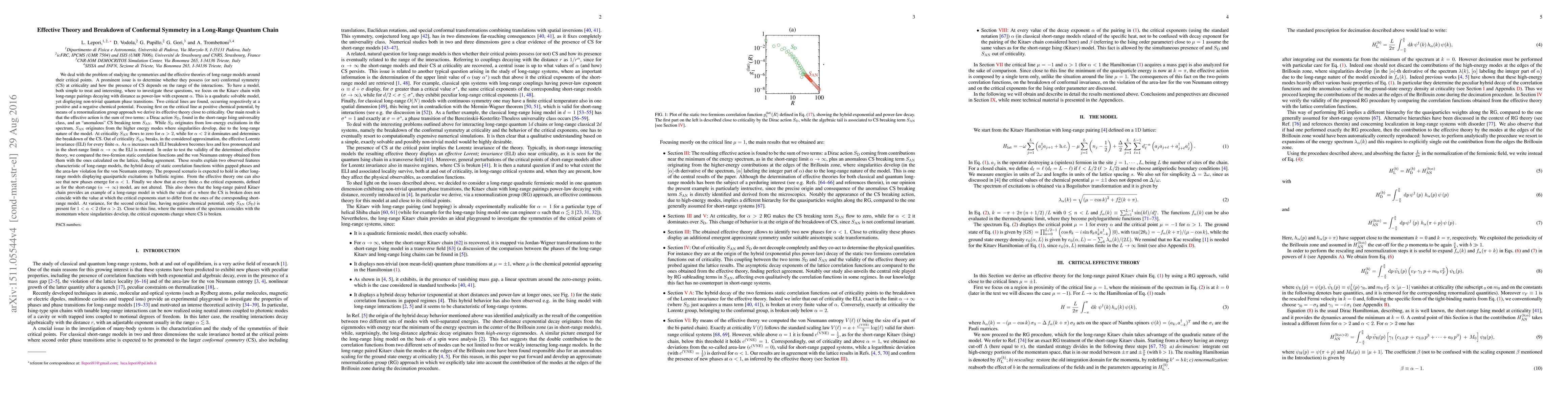 We deal with the problem of studying the effective theories and the symmetries of long-range models around critical points. We focus in particular on the Kitaev chain with long-range pairings decaying with distance as power-law with exponent $\alpha$. This is a quadratic solvable model, yet displaying non-trivial quantum phase transitions. By renormalization group approach we derive first the effective theory close to the critical line at positive chemical potential. This is the sum of two terms: a Dirac action $S_D$, found in the short-range Ising universality class, and a CS breaking term $S_{AN}$. While $S_D$ originates from low-energy excitations, $S_{AN}$ derives from the higher energy modes where singularities develop, due to the long-range nature of the model. At criticality $S_{AN}$ flows to zero if $\alpha > 2$, while if $\alpha < 2$ it dominates and determines the breakdown of the CS. Out of criticality $S_{AN}$ breaks, in the considered approximation, the effective Lorentz invariance (ELI) for every finite $\alpha$. As $\alpha$ increases, such ELI breakdown becomes less and less pronounced and in the short-range limit $\alpha \to \infty$ the ELI is restored. To test the validity of the effective theory, we compared the two-fermion static correlations and the von Neumann entropy obtained from them with the ones calculated on the lattice, finding agreement. From the effective theory one can also see that new phases emerge for $\alpha < 1$. Finally we show that at every finite $\alpha$ the critical exponents are the same as for the short-range ($\alpha \to \infty$) model. At variance, for the critical line with negative chemical potential, only $S_{AN}$ ($S_D$) is present for $1 < \alpha < 2$ (for $\alpha > 2$). Close to this line, where the minimum of the spectrum coincides with the momentum where singularities develop, the critical exponents change exactly where CS is broken.
