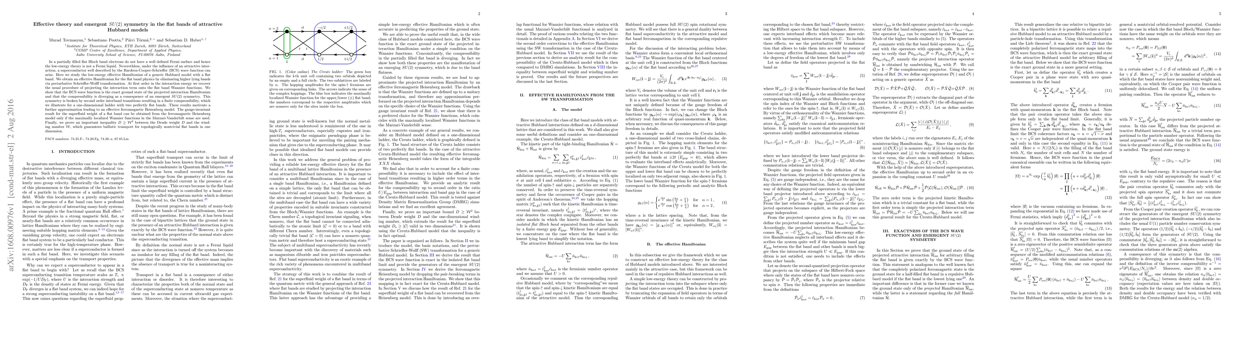 This paper investigates the low-energy effective Hamiltonian of attractive Hubbard models with flat bands, revealing an emergent $SU(2)$ symmetry and demonstrating that the BCS wave function is the exact ground state. It concludes with a derivation of an effective ferromagnetic Heisenberg model and proves an inequality ensuring ballistic transport for topologically nontrivial flat bands.