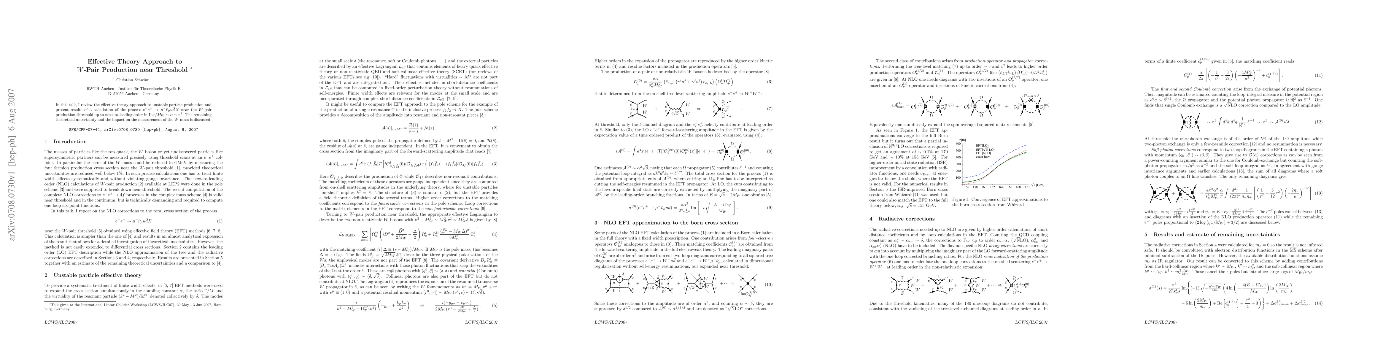 This paper reviews the effective theory approach to calculating W-pair production near its threshold, focusing on the process e- e+ -> mu- ν̅_mu u d̅ X up to next-to-leading order. It discusses the remaining theoretical uncertainties and their implications for measuring the W mass.