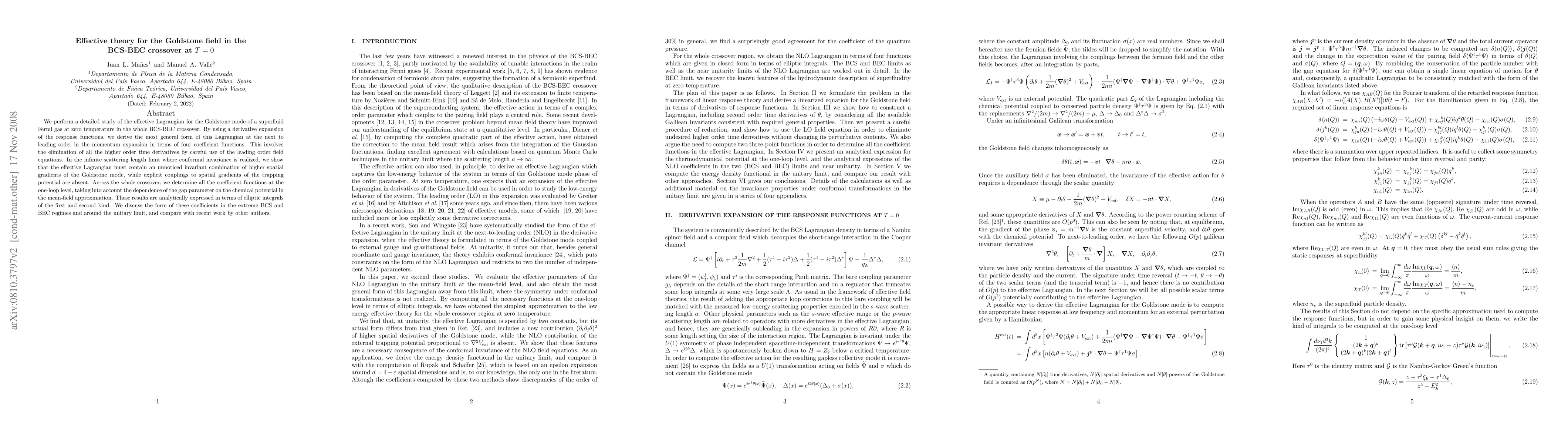 This paper develops an effective Lagrangian for the Goldstone mode in a superfluid Fermi gas across the BCS-BEC crossover at T=0, determining the most general form at next to leading order. The study reveals an invariant combination of higher spatial gradients in the infinite scattering length limit and provides analytical expressions for coefficient functions in terms of elliptic integrals.