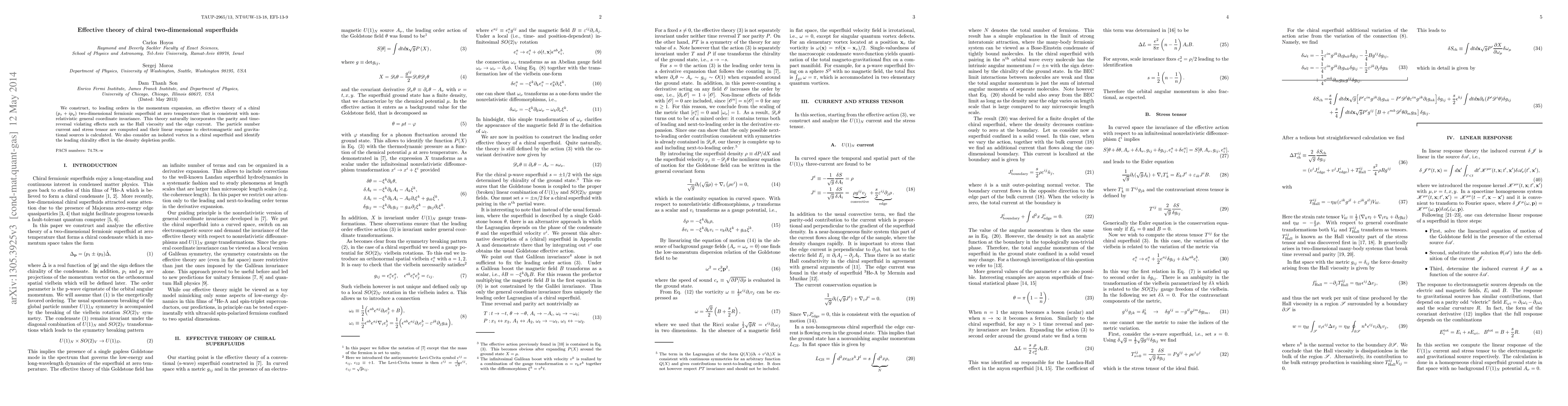 We construct, to leading orders in the momentum expansion, an effective theory of a chiral $p_x + ip_y$ two-dimensional fermionic superfluid at zero temperature that is consistent with nonrelativistic general coordinate invariance. This theory naturally incorporates the parity and time reversal violating effects such as the Hall viscosity and the edge current. The particle number current and stress tensor are computed and their linear response to electromagnetic and gravitational sources is calculated. We also consider an isolated vortex in a chiral superfluid and identify the leading chirality effect in the density depletion profile.
