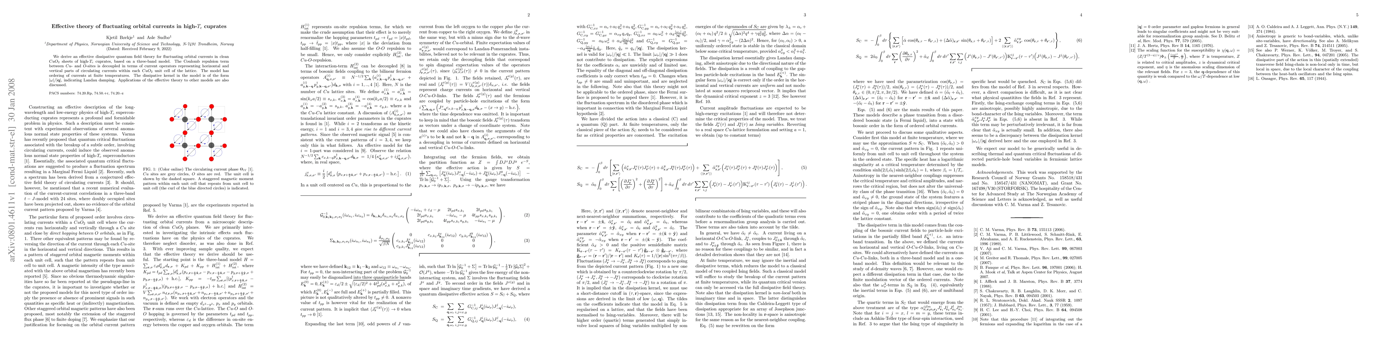 We derive an effective dissipative quantum field theory for fluctuating orbital currents in clean $CuO_2$ sheets of high-$T_c$ cuprates, based on a three-band model. The Coulomb repulsion term between $Cu$- and $O$-sites is decoupled in terms of current operators representing horizontal and vertical parts of circulating currents within each $CuO_2$ unit cell of the lattice. The model has ordering of currents at finite temperatures. The dissipative kernel in the model is of the form $|\omega|/|{\bf q}|$, indicating Landau damping. Applications of the effective theory to other models are also discussed.