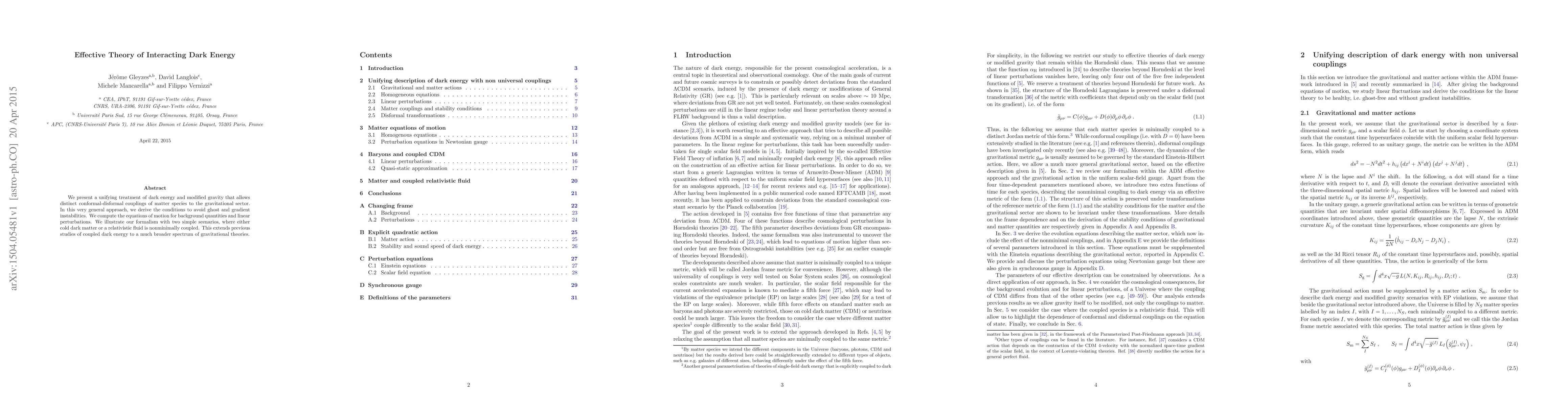 This research introduces a unified theory of dark energy and modified gravity, examining distinct matter-gravity interactions and ensuring stability. It demonstrates the theory through two simple scenarios, broadening the scope of coupled dark energy studies.