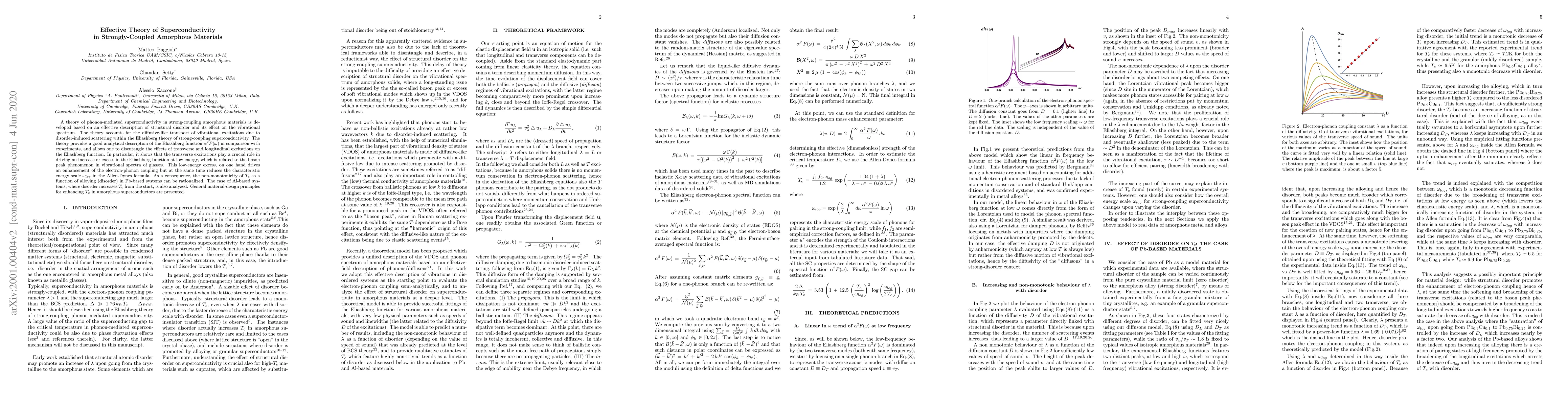 A theory of phonon-mediated superconductivity in strong-coupling amorphous materials is developed based on an effective description of structural disorder and its effect on the vibrational spectrum. The theory accounts for the diffusive-like transport of vibrational excitations due to disorder-induced scattering within the Eliashberg theory of strong-coupling superconductivity. The theory provides a good analytical description of the Eliashberg function $\alpha^{2}F(\omega)$ in comparison with experiments, and allows one to disentangle the effects of transverse and longitudinal excitations on the Eliashberg function. In particular, it shows that the transverse excitations play a crucial role in driving an increase or excess in the Eliashberg function at low energy, which is related to the boson peak phenomenon in vibrational spectra of glasses. This low-energy excess, on one hand drives an enhancement of the electron-phonon coupling but at the same time reduces the characteristic energy scale $\omega_{log}$ in the Allen-Dynes formula. As a consequence, the non-monotonicity of $T_{c}$ as a function of alloying (disorder) in $\text{Pb}$-based systems can be rationalized. The case of $\text{Al}$-based systems, where disorder increases $T_{c}$ from the start, is also analyzed. General material-design principles for enhancing $T_{c}$ in amorphous superconductors are presented.