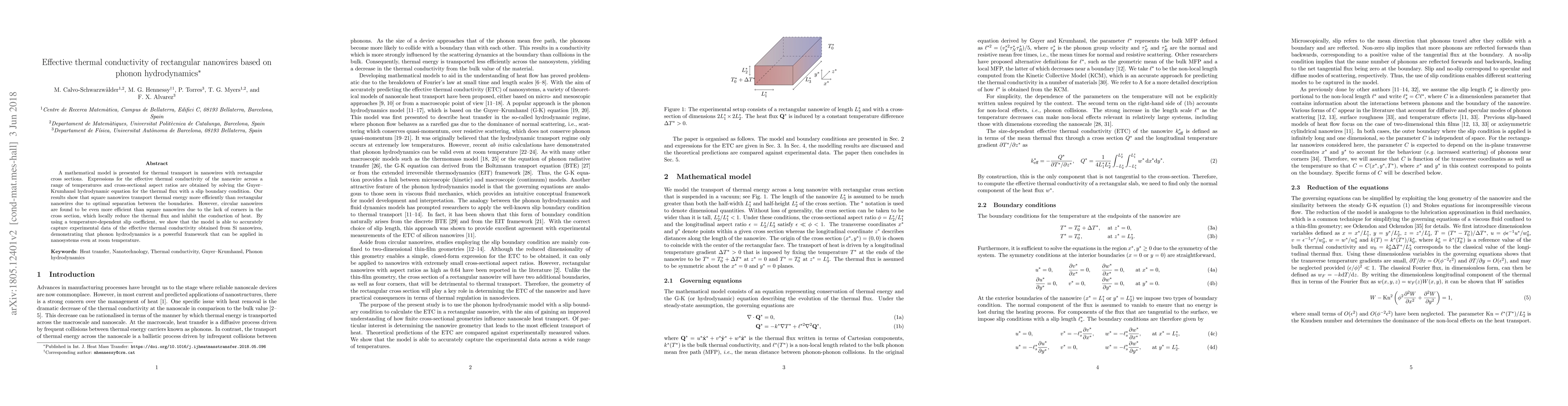 This paper develops a mathematical model for thermal transport in rectangular nanowires using phonon hydrodynamics, showing that square nanowires are more efficient than rectangular ones due to optimal boundary separation. Circular nanowires are found to be even more efficient due to the absence of corners that hinder heat conduction, and the model accurately matches experimental data from Si nanowires.