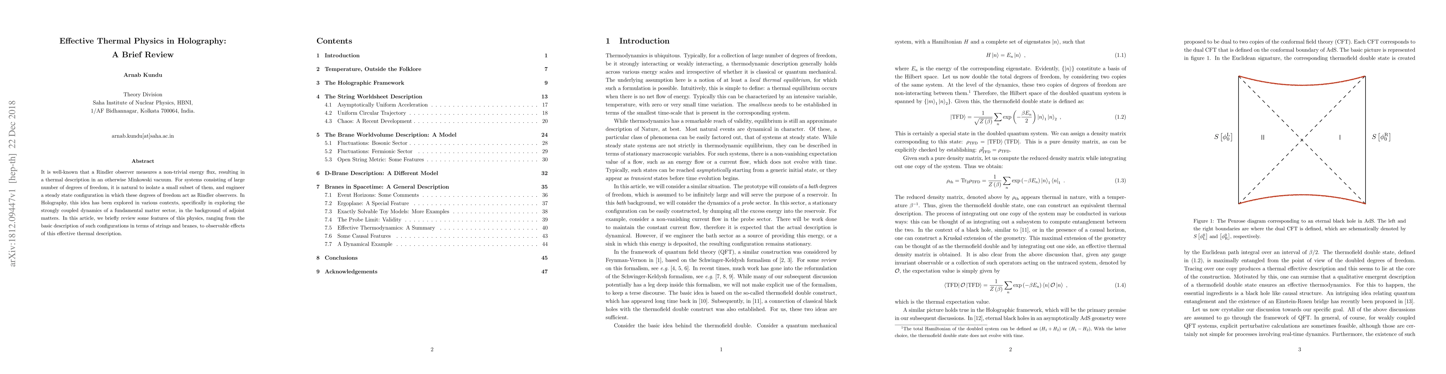 This paper reviews the thermal physics in holography, focusing on how a subset of degrees of freedom can be engineered to mimic Rindler observers, leading to a thermal description in a Minkowski vacuum. It explores the strongly coupled dynamics of fundamental matter sectors in the background of adjoint matters, highlighting observable effects and configurations involving strings and branes.