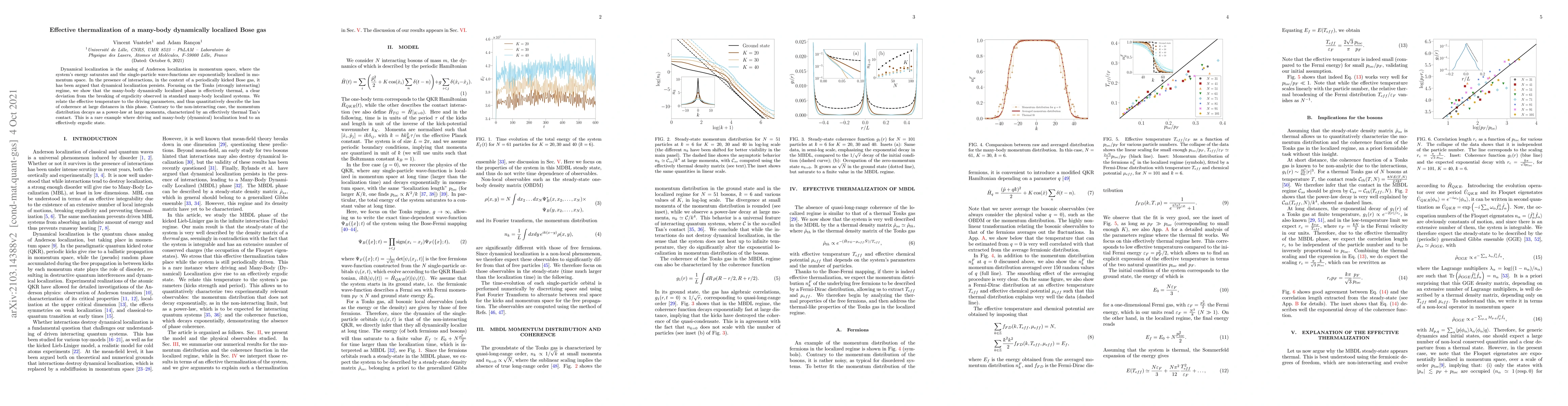 This paper investigates the thermalization in a many-body dynamically localized Bose gas, demonstrating that despite localization, the system behaves effectively thermal. Unlike typical many-body localized systems, this regime exhibits an ergodic state with a power-law decay in momentum distribution, characterized by an effectively thermal Tan's contact.