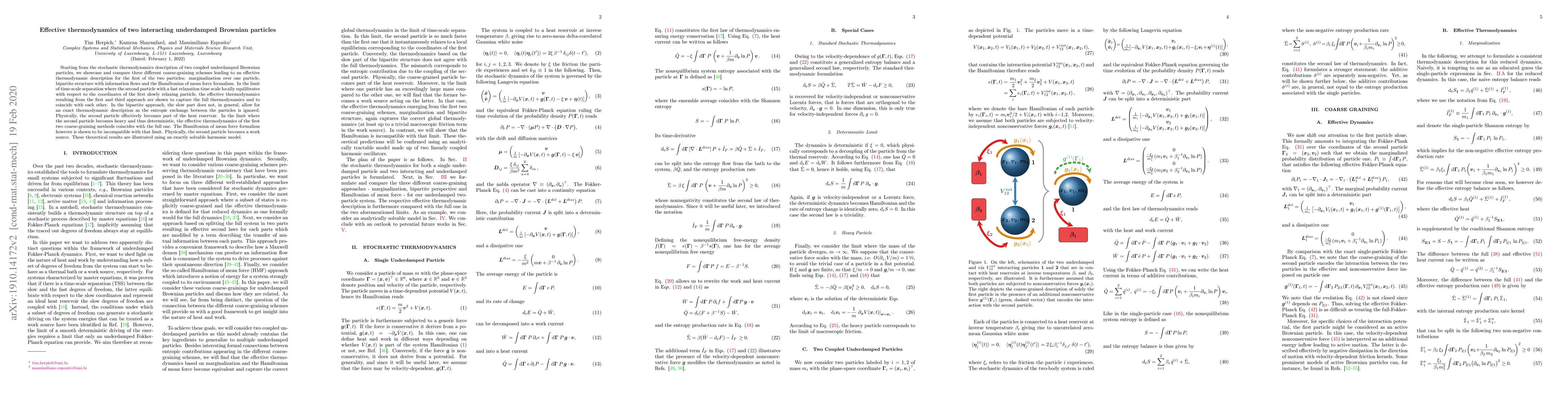 This paper explores effective thermodynamics for two interacting underdamped Brownian particles, comparing three coarse-graining schemes: marginalization, bipartite structure, and Hamiltonian of mean force. In the time-scale separation limit, the first two methods yield identical effective thermodynamics, while the bipartite approach neglects entropic exchanges.