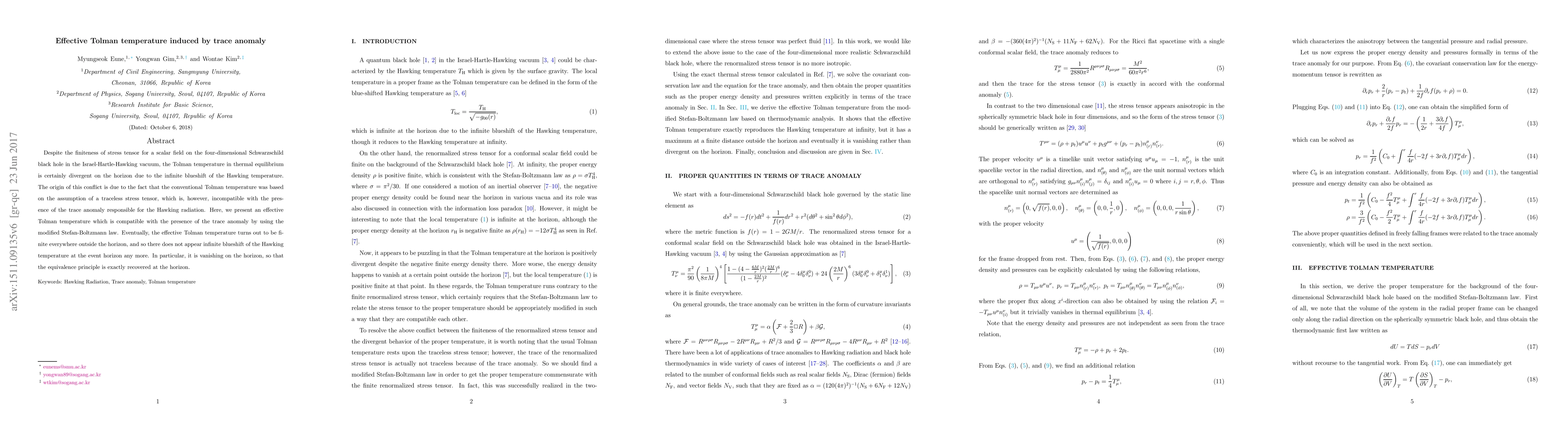 This paper proposes an effective Tolman temperature that resolves the divergence issue caused by the infinite blueshift of the Hawking temperature near the event horizon of a Schwarzschild black hole. It achieves this by incorporating the trace anomaly into the modified Stefan-Boltzmann law, resulting in a finite temperature everywhere outside the horizon and restoring the equivalence principle.