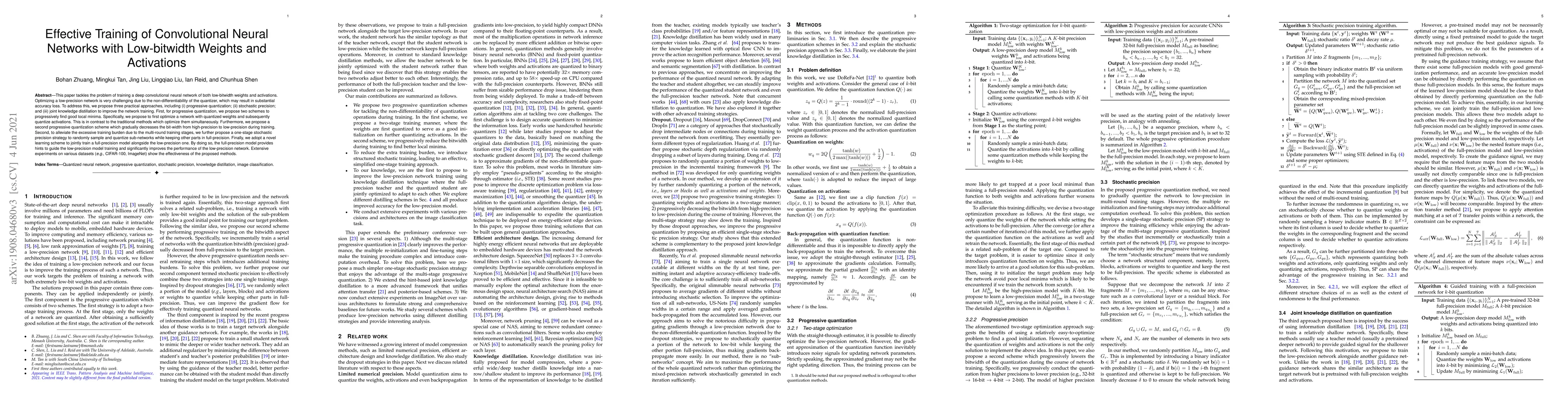 This paper proposes three methods to effectively train convolutional neural networks with low-bitwidth weights and activations, addressing the non-differentiability of quantizers. The approaches include progressive quantization, stochastic precision, and joint knowledge distillation, demonstrating improved performance on datasets like CIFAR-100 and ImageNet.