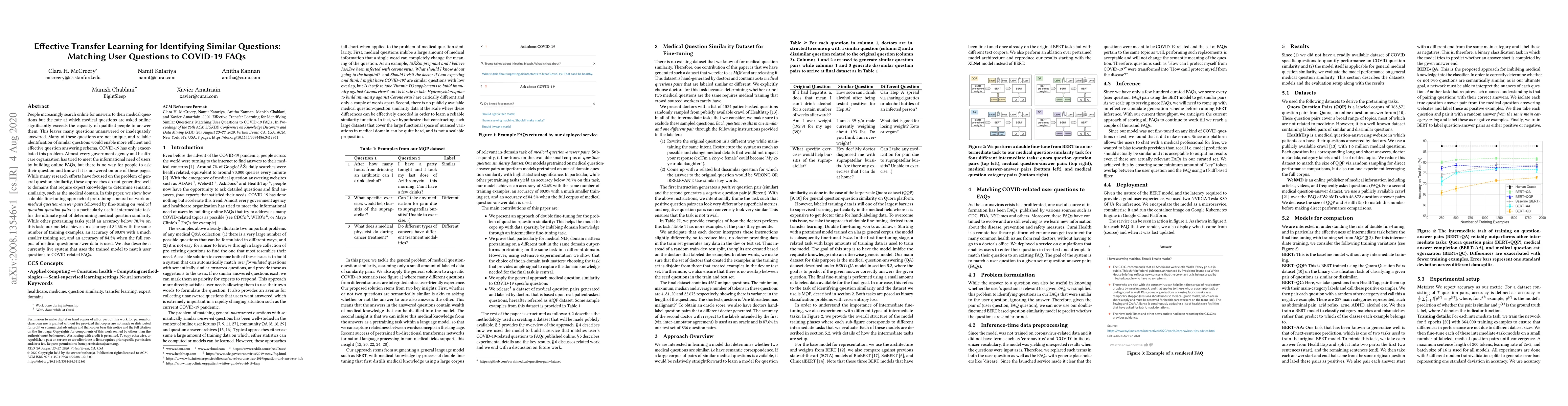 This paper proposes a double fine-tuning method for neural networks to identify similar medical questions, achieving an accuracy of 82.6% compared to 78.7% with other methods. The approach effectively matches user questions to COVID-19 FAQs, addressing the gap in answering online medical queries.
