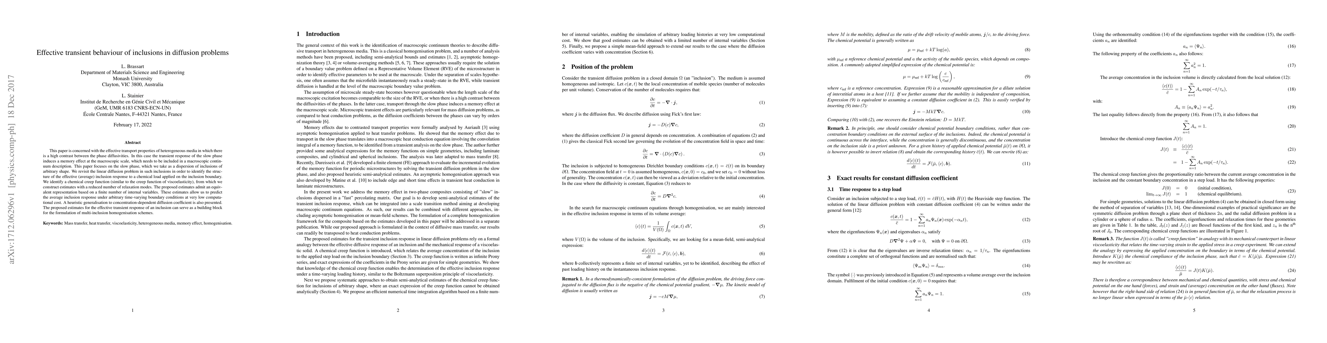 This paper is concerned with the effective transport properties of heterogeneous media in which there is a high contrast between the phase diffusivities. In this case the transient response of the slow phase induces a memory effect at the macroscopic scale, which needs to be included in a macroscopic continuum description. This paper focuses on the slow phase, which we take as a dispersion of inclusions of arbitrary shape. We revisit the linear diffusion problem in such inclusions in order to identify the structure of the effective (average) inclusion response to a chemical load applied on the inclusion boundary. We identify a chemical creep function (similar to the creep function of viscoelasticity), from which we construct estimates with a reduced number of relaxation modes. The proposed estimates admit an equivalent representation based on a finite number of internal variables. These estimates allow us to predict the average inclusion response under arbitrary time-varying boundary conditions at very low computational cost. A heuristic generalisation to concentration-dependent diffusion coefficient is also presented. The proposed estimates for the effective transient response of an inclusion can serve as a building block for the formulation of multi-inclusion homogenisation schemes.