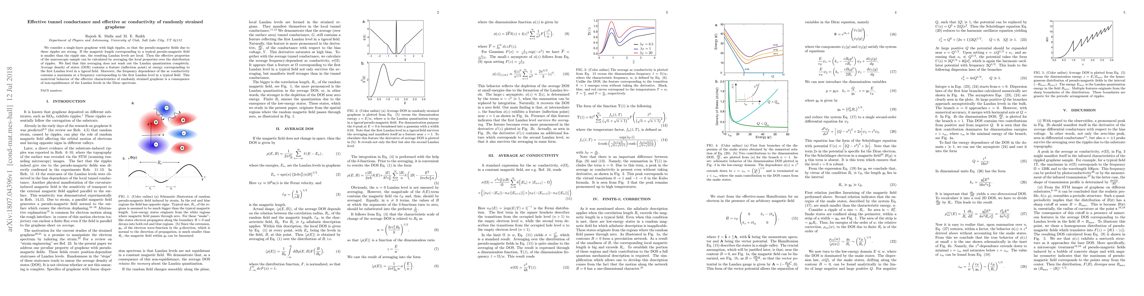 Summary: The research explores the effective conductance and ac conductivity of rippled, randomly strained graphene, revealing an inflection point in the average density of states and a peak in average ac conductivity at the first Landau level energy due to non-equidistant Landau levels in the Dirac spectrum.
