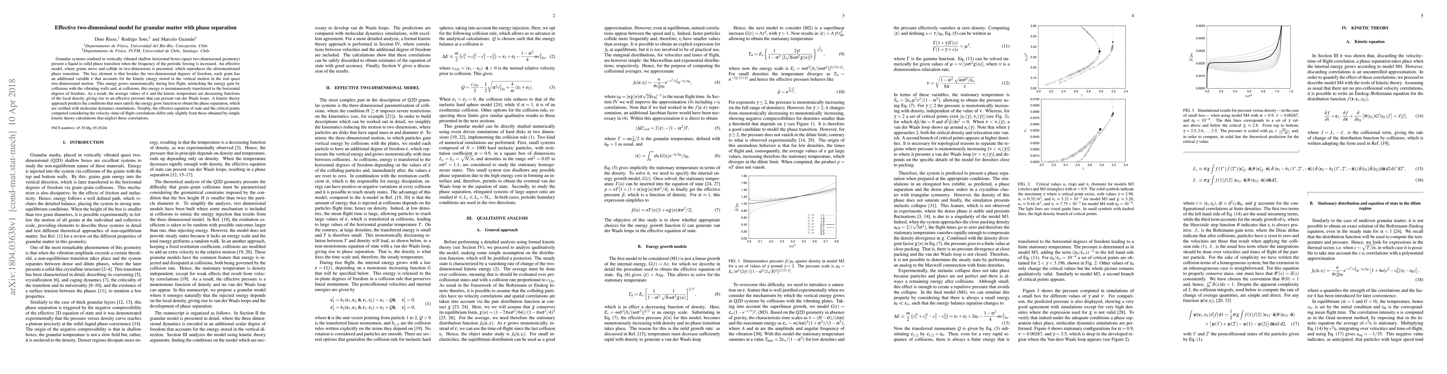 Granular systems confined in vertically vibrated shallow horizontal boxes (quasi two-dimensional geometry) present a liquid to solid phase transition when the frequency of the periodic forcing is increased. An effective model, where grains move and collide in two-dimensions is presented, which reproduces the aforementioned phase transition. The key element is that besides the two-dimensional degrees of freedom, each grain has an additional variable $\epsilon$ that accounts for the kinetic energy stored in the vertical motion in the real quasi two-dimensional motion. This energy grows monotonically during free flight, mimicking the energy gain by collisions with the vibrating walls and, at collisions, this energy is instantaneously transferred to the horizontal degrees of freedom. As a result, the average values of $\epsilon$ and the kinetic temperature are decreasing functions of the local density, giving rise to an effective pressure that can present van der Waals loops. A kinetic theory approach predicts the conditions that must satisfy the energy grow function to obtain the phase separation, which are verified with molecular dynamics simulations. Notably, the effective equation of state and the critical points computed considering the velocity--time-of-flight correlations differ only slightly from those obtained by simple kinetic theory calculations that neglect those correlations.