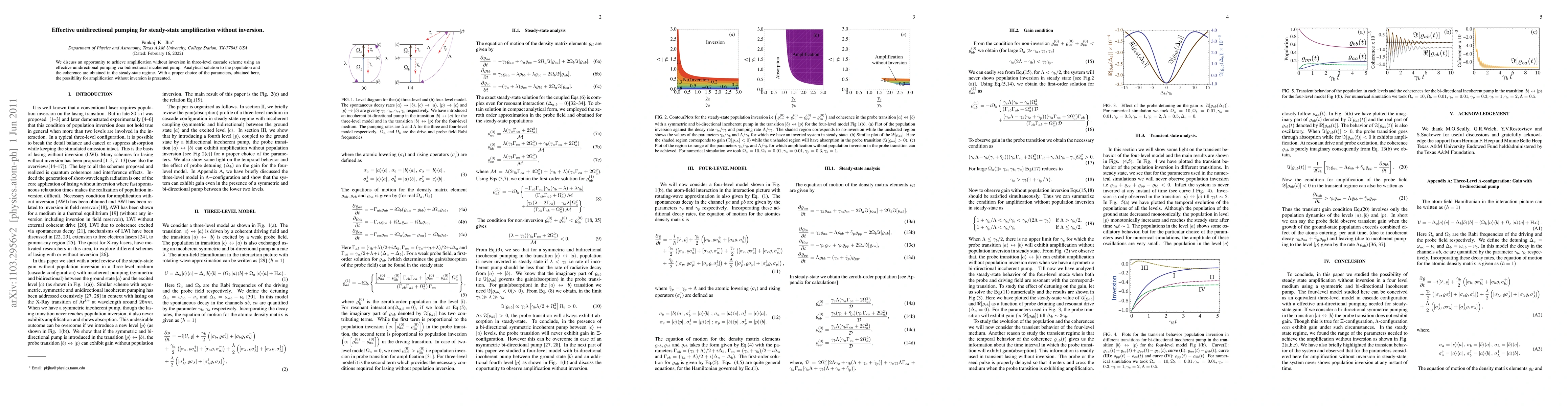 This paper explores a three-level cascade scheme to achieve amplification without inversion through effective unidirectional pumping using a bidirectional incoherent pump. Analytical solutions reveal the conditions under which steady-state amplification can occur without population inversion.