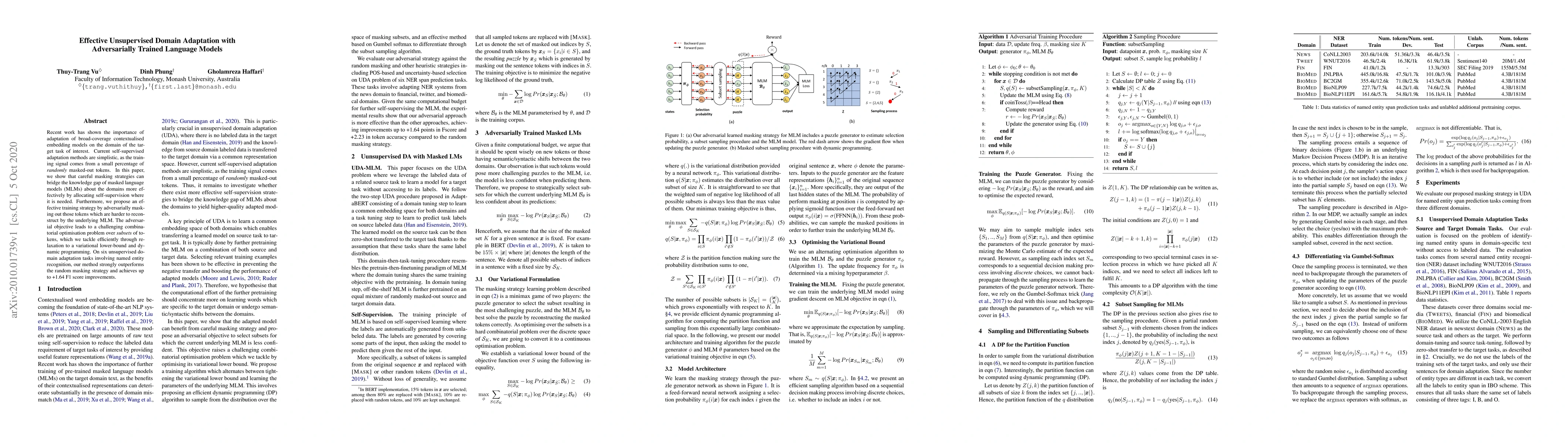 This paper proposes an effective unsupervised domain adaptation method using adversarially trained language models, which employs strategic masking of difficult tokens to improve domain adaptation over random masking. The method achieves significant improvements in F1 score on six domain adaptation tasks.