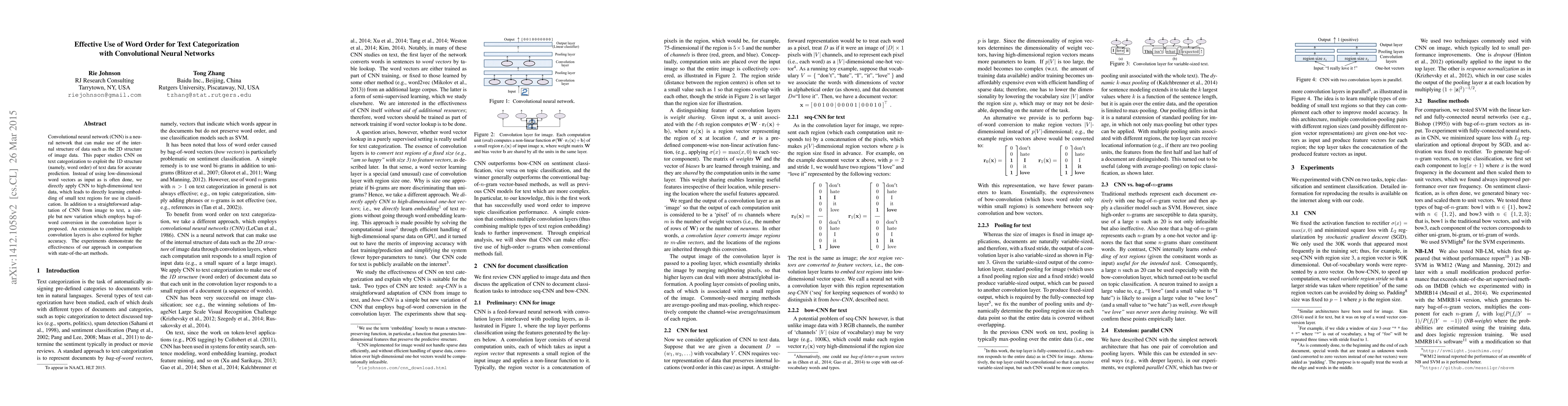 This paper investigates the use of convolutional neural networks (CNN) for text categorization by exploiting word order, directly applying CNN to high-dimensional text data to learn embeddings of small text regions. A novel variation using bag-of-word conversion in the convolution layer and multiple convolution layers is proposed for improved accuracy, demonstrating superior performance compared to state-of-the-art methods.