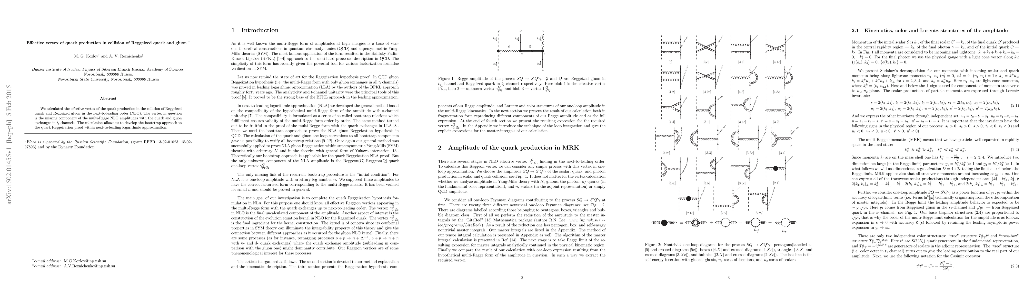 This paper calculates the effective vertex for quark production in collisions involving Reggeized quarks and gluons at next-to-leading order, filling a gap in multi-Regge NLO amplitudes. This calculation aids in developing a bootstrap method for proving quark Reggeization within next-to-leading logarithmic approximation.