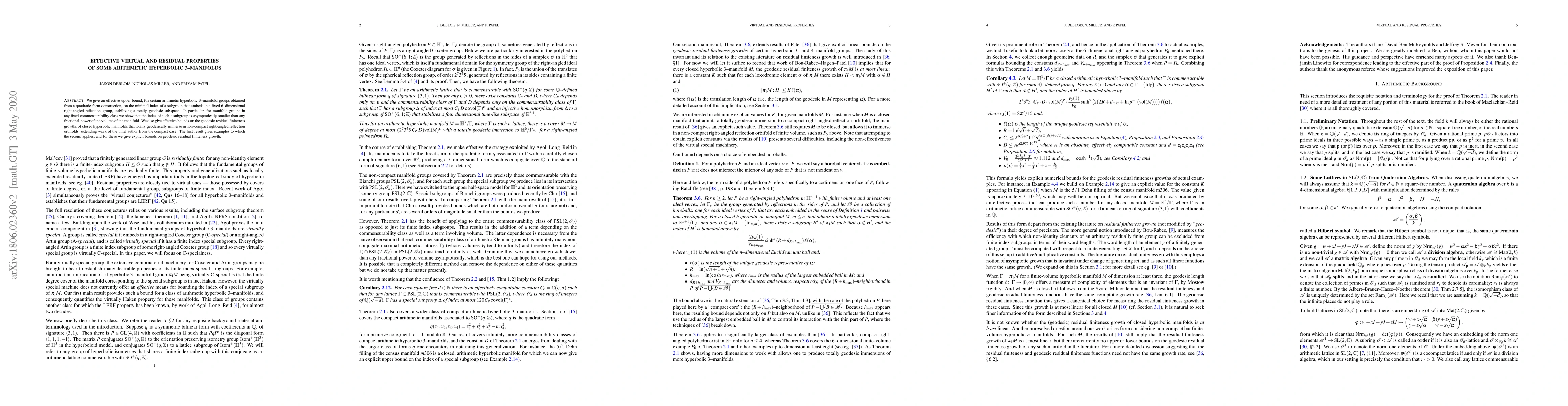 The paper establishes effective upper bounds on the minimal index of certain subgroups within arithmetic hyperbolic 3-manifolds, demonstrating that these indices are asymptotically smaller than fractional powers of the manifold's volume. It also provides effective bounds on the geodesic residual finiteness growths for closed hyperbolic manifolds embedding in non-compact right-angled reflection orbifolds.