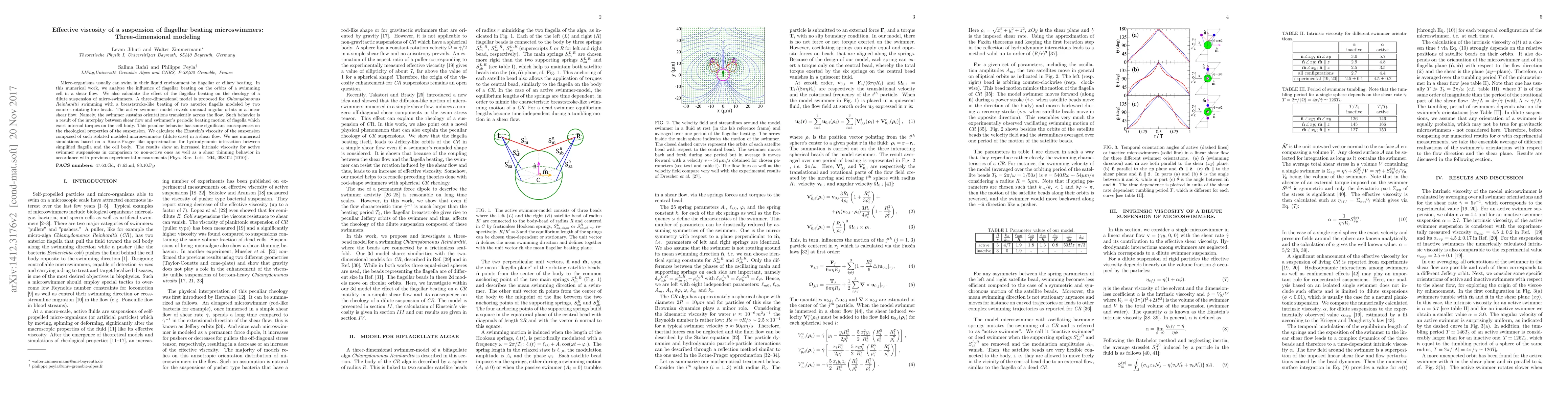 Micro-organisms usually can swim in their liquid environment by flagellar or ciliary beating. In this numerical work, we analyze the influence of flagellar beating on the orbits of a swimming cell in a shear flow. We also calculate the effect of the flagellar beating on the rheology of a dilute suspension of micro-swimmers. A three-dimensional model is proposed for Chlamydomonas Reinhardtii swimming with a breaststroke-like beating of two anterior flagella modeled by two counter-rotating fore beads. The active swimmer model reveals unusual angular orbits in a linear shear flow. Namely, the swimmer sustains orientations transiently across the flow. Such behavior is a result of the interplay between shear flow and swimmer's periodic beating motion of flagella which exert internal torques on the cell body. This peculiar behavior has some significant consequences on the rheological properties of the suspension. We calculate the Einstein's viscosity of the suspension composed of such isolated modeled microswimmers (dilute case) in a shear flow. We use numerical simulations based on a Rotne-Prager like approximation for hydrodynamic interaction between simplified flagella and the cell body. The results show an increased intrinsic viscosity for active swimmer suspensions in comparison to non-active ones as well as a shear thinning behavior in accordance with previous experimental measurements [Phys. Rev. Lett. 104 , 098102 (2010)].