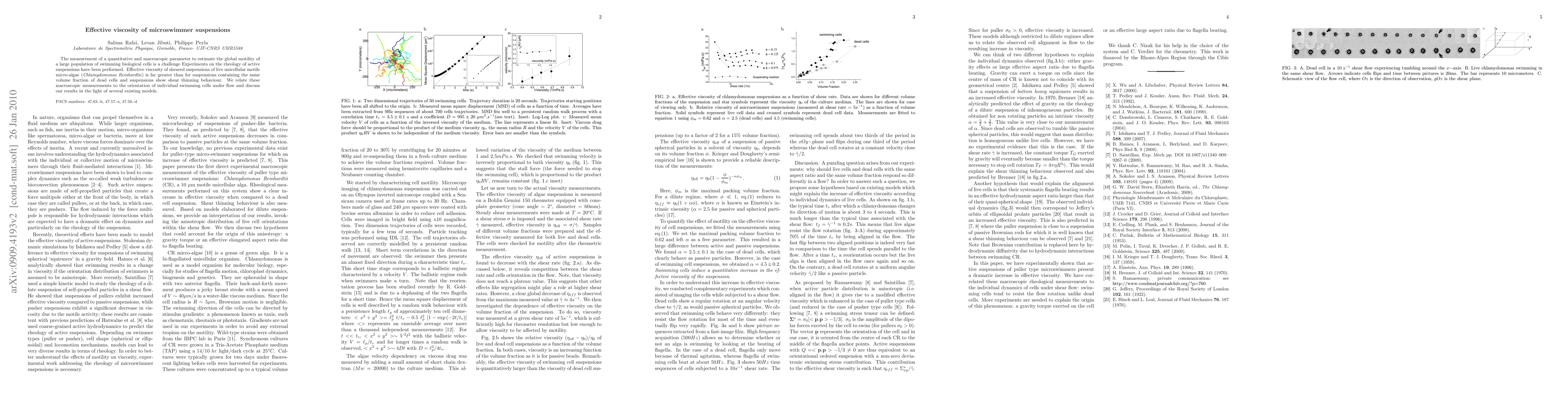 Experiments on rheology of active suspensions were performed using live unicellular motile micro-algae (Chlamydomonas Reinhardtii). Effective viscosity of sheared suspensions was measured using a Bohlin Gemini150 rheometer with cone-plate geometry. Steady shear measurements were made at 20°C, and effective viscosity (ηeff) was calculated as ηeff = σ/˙γ, where σ is the imposed shear stress and ˙γ is the associated shear rate.