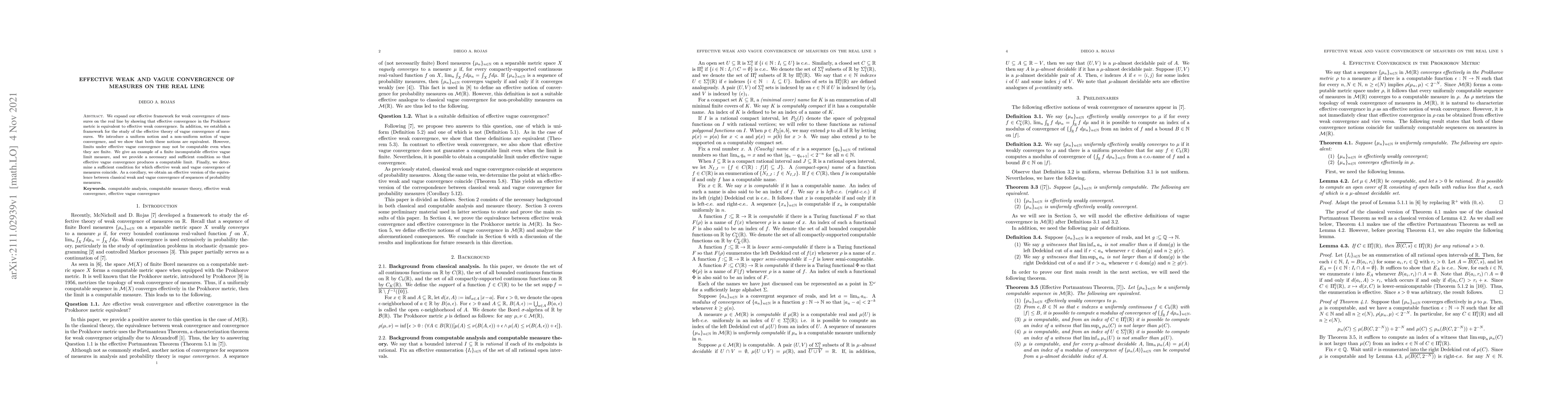 This paper extends the effective framework for weak convergence of measures on the real line, demonstrating equivalence between effective convergence in the Prokhorov metric and effective weak convergence. It also introduces and compares uniform and non-uniform notions of effective vague convergence, showing their equivalence, while noting that effective vague limits may not always be computable. The paper provides conditions for computable limits and a sufficient condition for the coincidence of effective weak and vague convergence.