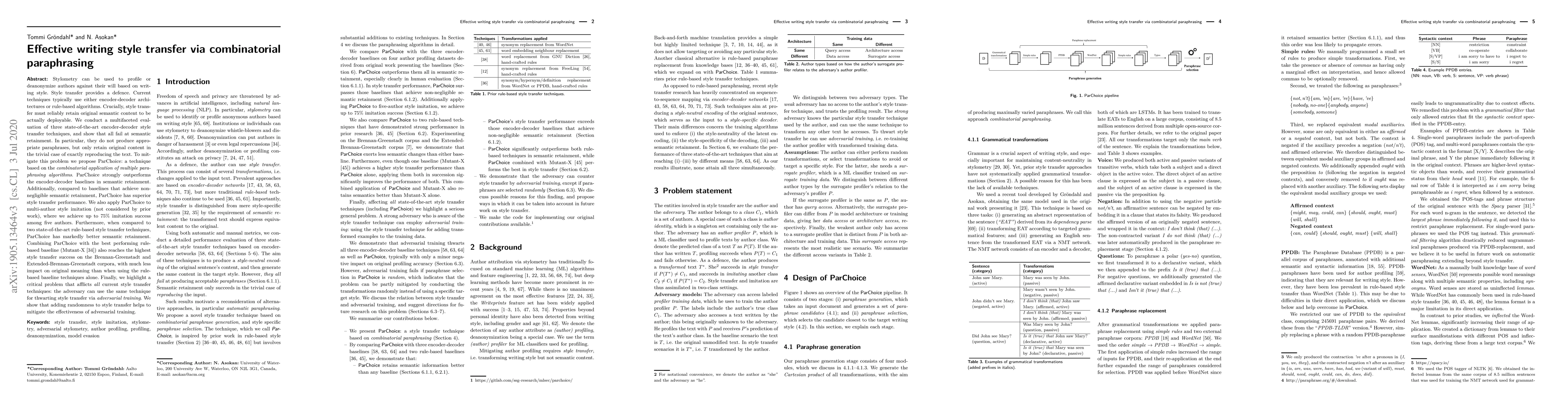 Stylometry can be used to profile or deanonymize authors against their will based on writing style. Style transfer provides a defence. Current techniques typically use either encoder-decoder architectures or rule-based algorithms. Crucially, style transfer must reliably retain original semantic content to be actually deployable. We conduct a multifaceted evaluation of three state-of-the-art encoder-decoder style transfer techniques, and show that all fail at semantic retainment. In particular, they do not produce appropriate paraphrases, but only retain original content in the trivial case of exactly reproducing the text. To mitigate this problem we propose ParChoice: a technique based on the combinatorial application of multiple paraphrasing algorithms. ParChoice strongly outperforms the encoder-decoder baselines in semantic retainment. Additionally, compared to baselines that achieve non-negligible semantic retainment, ParChoice has superior style transfer performance. We also apply ParChoice to multi-author style imitation (not considered by prior work), where we achieve up to 75% imitation success among five authors. Furthermore, when compared to two state-of-the-art rule-based style transfer techniques, ParChoice has markedly better semantic retainment. Combining ParChoice with the best performing rule-based baseline (Mutant-X) also reaches the highest style transfer success on the Brennan-Greenstadt and Extended-Brennan-Greenstadt corpora, with much less impact on original meaning than when using the rule-based baseline techniques alone. Finally, we highlight a critical problem that afflicts all current style transfer techniques: the adversary can use the same technique for thwarting style transfer via adversarial training. We show that adding randomness to style transfer helps to mitigate the effectiveness of adversarial training.