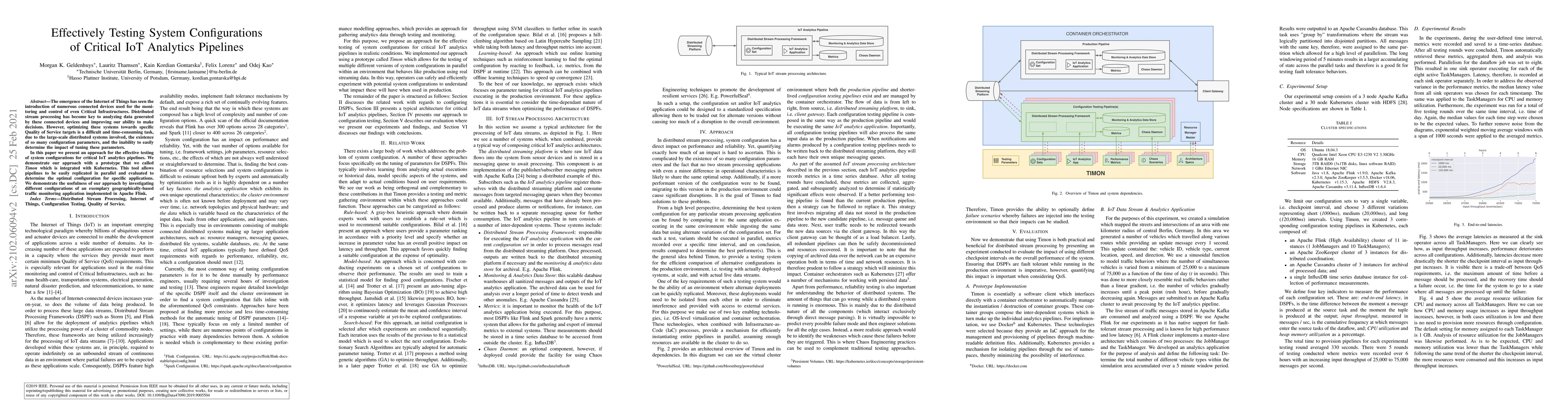 The emergence of the Internet of Things has seen the introduction of numerous connected devices used for the monitoring and control of even Critical Infrastructures. Distributed stream processing has become key to analyzing data generated by these connected devices and improving our ability to make decisions. However, optimizing these systems towards specific Quality of Service targets is a difficult and time-consuming task, due to the large-scale distributed systems involved, the existence of so many configuration parameters, and the inability to easily determine the impact of tuning these parameters. In this paper we present an approach for the effective testing of system configurations for critical IoT analytics pipelines. We demonstrate our approach with a prototype that we called Timon which is integrated with Kubernetes. This tool allows pipelines to be easily replicated in parallel and evaluated to determine the optimal configuration for specific applications. We demonstrate the usefulness of our approach by investigating different configurations of an exemplary geographically-based traffic monitoring application implemented in Apache Flink.