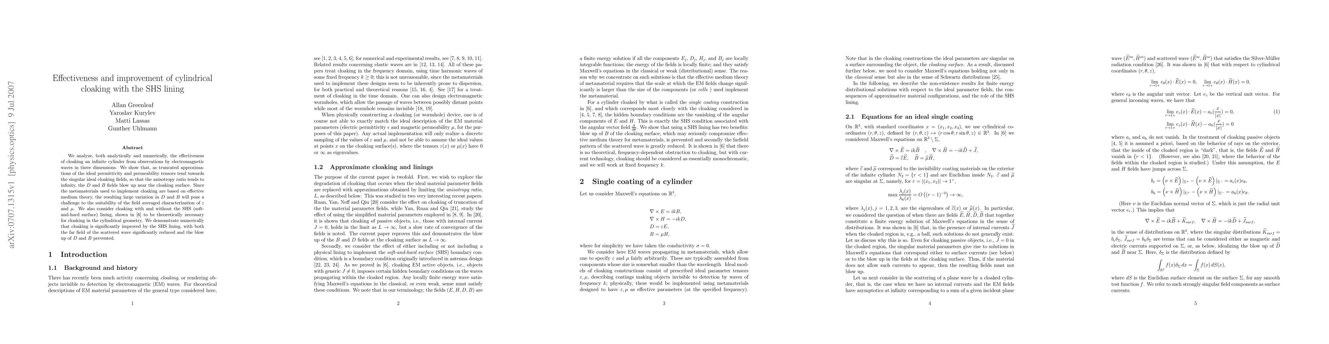 We analyze, both analytically and numerically, the effectiveness of cloaking an infinite cylinder from observations by electromagnetic waves in three dimensions. We show that, as truncated approximations of the ideal permittivity and permeability tensors tend towards the singular ideal cloaking fields, so that the anisotropy ratio tends to infinity, the $D$ and $B$ fields blow up near the cloaking surface. We also consider cloaking with and without the SHS (soft-and-hard surface) lining. We demonstrate numerically that cloaking is significantly improved by the SHS lining, with both the far field of the scattered wave significantly reduced and the blow up of $D$ and $B$ prevented.