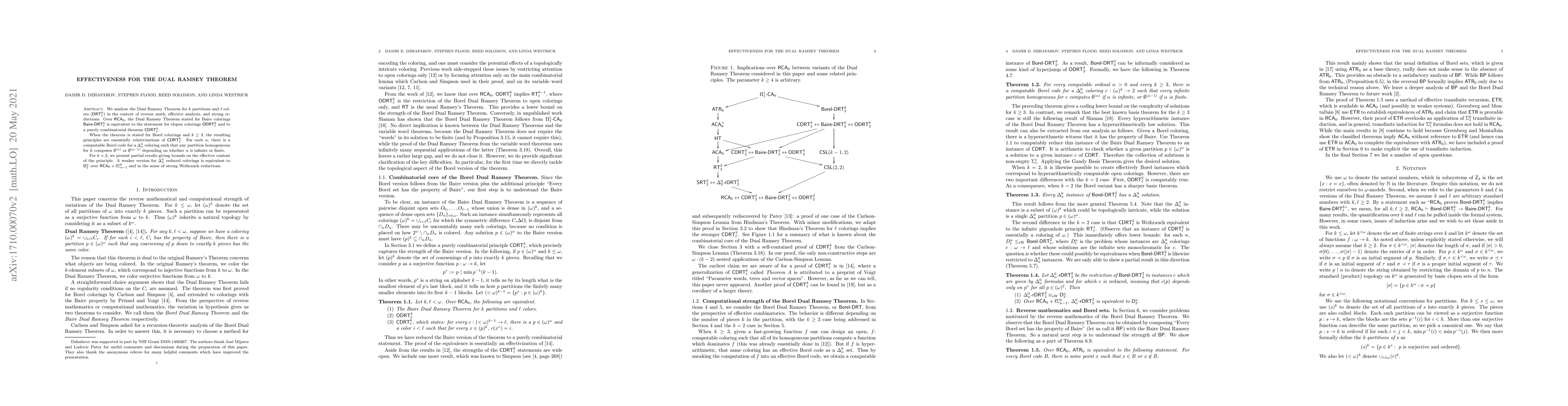We analyze the Dual Ramsey Theorem for $k$ partitions and $\ell$ colors ($\mathsf{DRT}^k_\ell$) in the context of reverse math, effective analysis, and strong reductions. Over $\mathsf{RCA}_0$, the Dual Ramsey Theorem stated for Baire colorings is equivalent to the statement for clopen colorings and to a purely combinatorial theorem $\mathsf{cDRT}^k_\ell$. When the theorem is stated for Borel colorings and $k\geq 3$, the resulting principles are essentially relativizations of $\mathsf{cDRT}^k_\ell$. For each $\alpha$, there is a computable Borel code for a $\Delta^0_\alpha$ coloring such that any partition homogeneous for it computes $\emptyset^{(\alpha)}$ or $\emptyset^{(\alpha-1)}$ depending on whether $\alpha$ is infinite or finite. For $k=2$, we present partial results giving bounds on the effective content of the principle. A weaker version for $\Delta^0_n$ reduced colorings is equivalent to $\mathsf{D}^n_2$ over $\mathsf{RCA}_0+\mathsf{I}\Sigma^0_{n-1}$ and in the sense of strong Weihrauch reductions.