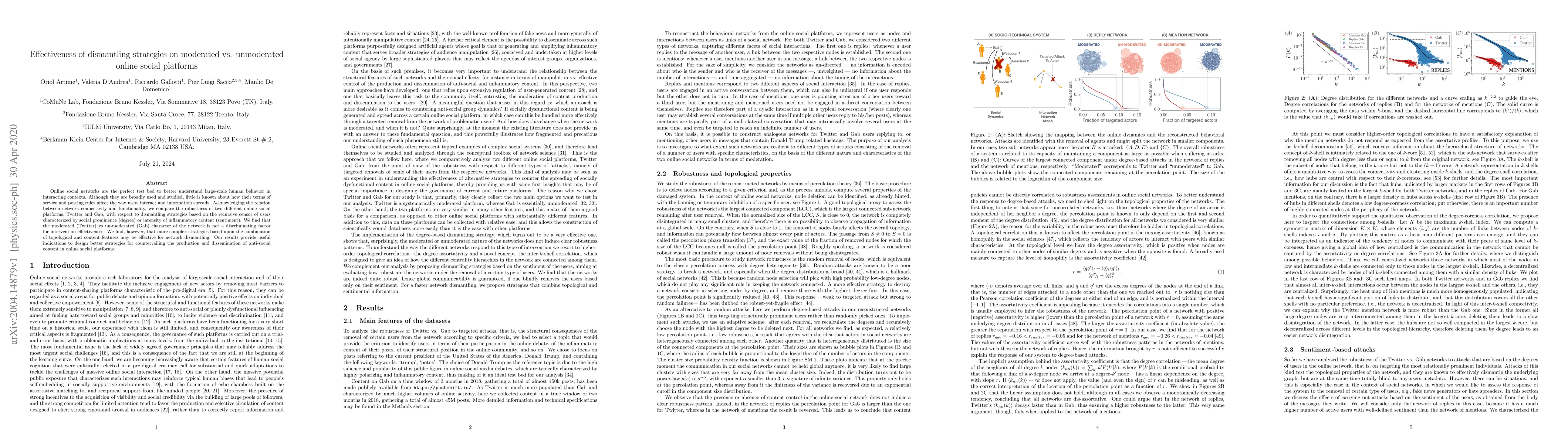 Online social networks are the perfect test bed to better understand large-scale human behavior in interacting contexts. Although they are broadly used and studied, little is known about how their terms of service and posting rules affect the way users interact and information spreads. Acknowledging the relation between network connectivity and functionality, we compare the robustness of two different online social platforms, Twitter and Gab, with respect to dismantling strategies based on the recursive censor of users characterized by social prominence (degree) or intensity of inflammatory content (sentiment). We find that the moderated (Twitter) vs unmoderated (Gab) character of the network is not a discriminating factor for intervention effectiveness. We find, however, that more complex strategies based upon the combination of topological and content features may be effective for network dismantling. Our results provide useful indications to design better strategies for countervailing the production and dissemination of anti-social content in online social platforms.