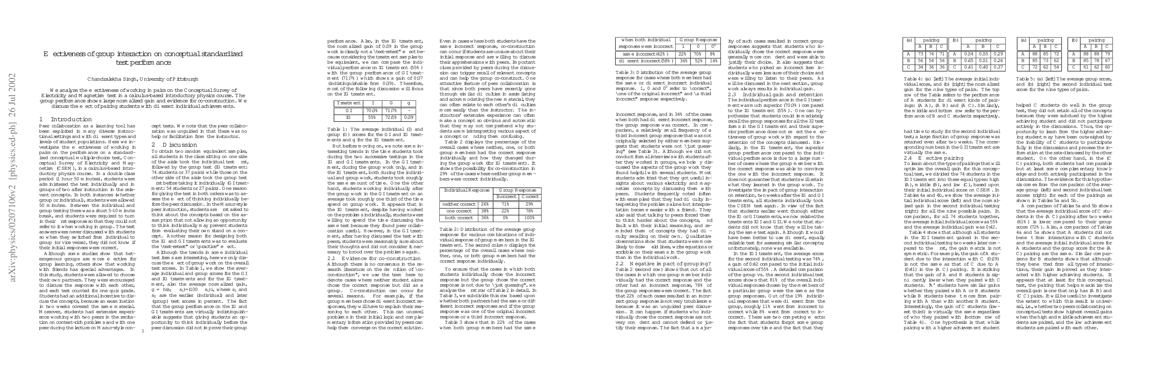 We analyze the effectiveness of working in pairs on the Conceptual Survey of Electricity and Magnetism test in a calculus-based introductory physics course. The group performance shows large normalized gain and evidence for co-construction. We discuss the effect of pairing students with different individual achievements.