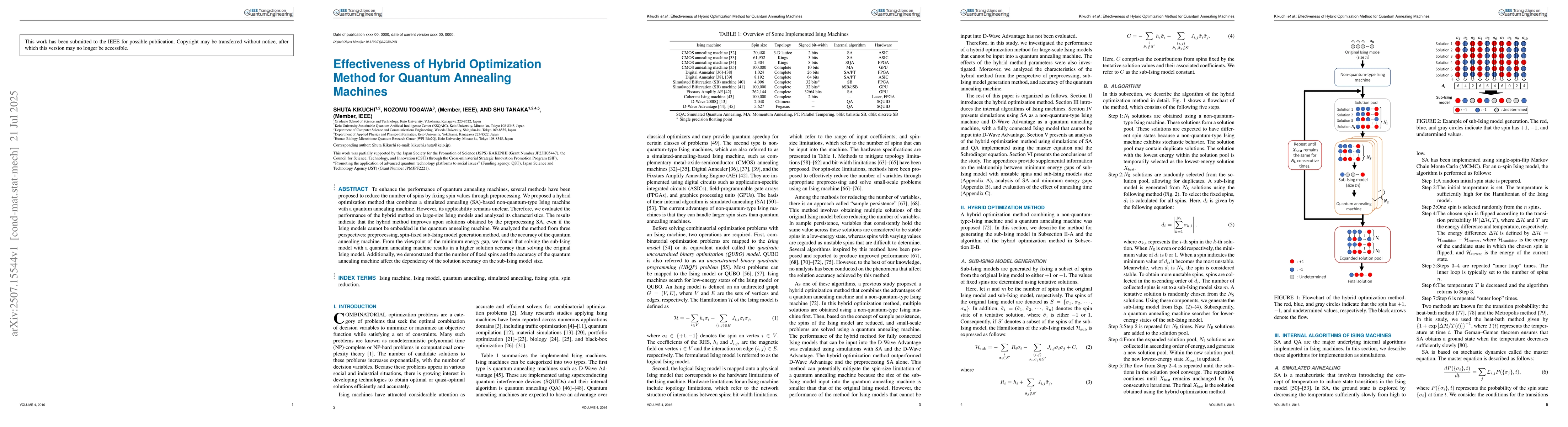 To enhance the performance of quantum annealing machines, several methods have been proposed to reduce the number of spins by fixing spin values through preprocessing. We proposed a hybrid optimization method that combines a simulated annealing (SA)-based non-quantum-type Ising machine with a quantum annealing machine. However, its applicability remains unclear. Therefore, we evaluated the performance of the hybrid method on large-size Ising models and analyzed its characteristics. The results indicate that the hybrid method improves upon solutions obtained by the preprocessing SA, even if the Ising models cannot be embedded in the quantum annealing machine. We analyzed the method from three perspectives: preprocessing, spin-fixed sub-Ising model generation method, and the accuracy of the quantum annealing machine. From the viewpoint of the minimum energy gap, we found that solving the sub-Ising model with a quantum annealing machine results in a higher solution accuracy than solving the original Ising model. Additionally, we demonstrated that the number of fixed spins and the accuracy of the quantum annealing machine affect the dependency of the solution accuracy on the sub-Ising model size.