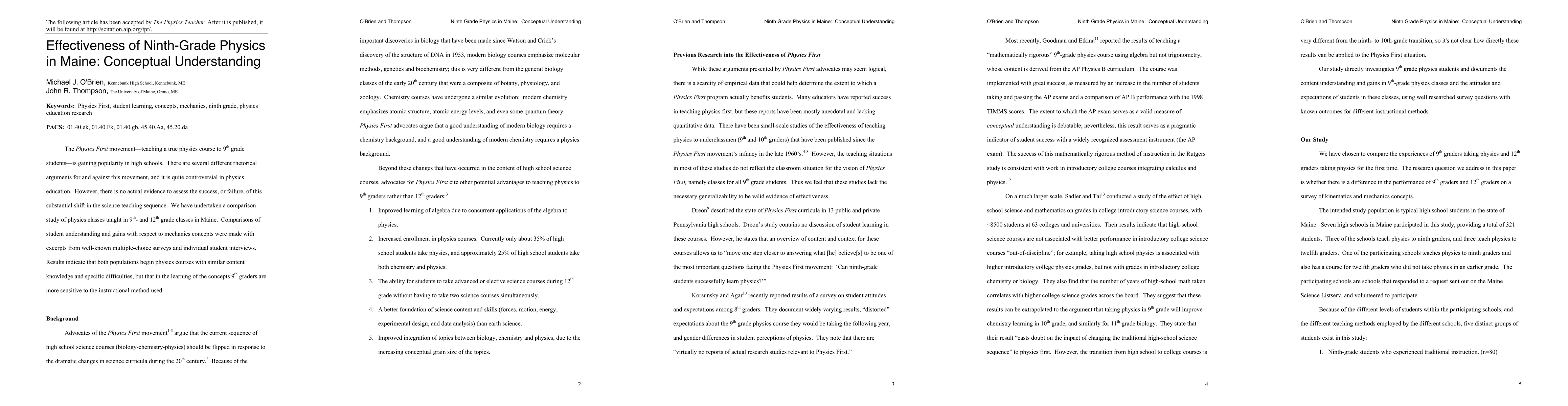 This study compares ninth-grade and 12th-grade physics students in Maine, finding similar initial content knowledge but greater sensitivity of ninth graders to instructional methods, suggesting a need for tailored teaching strategies for younger learners.
