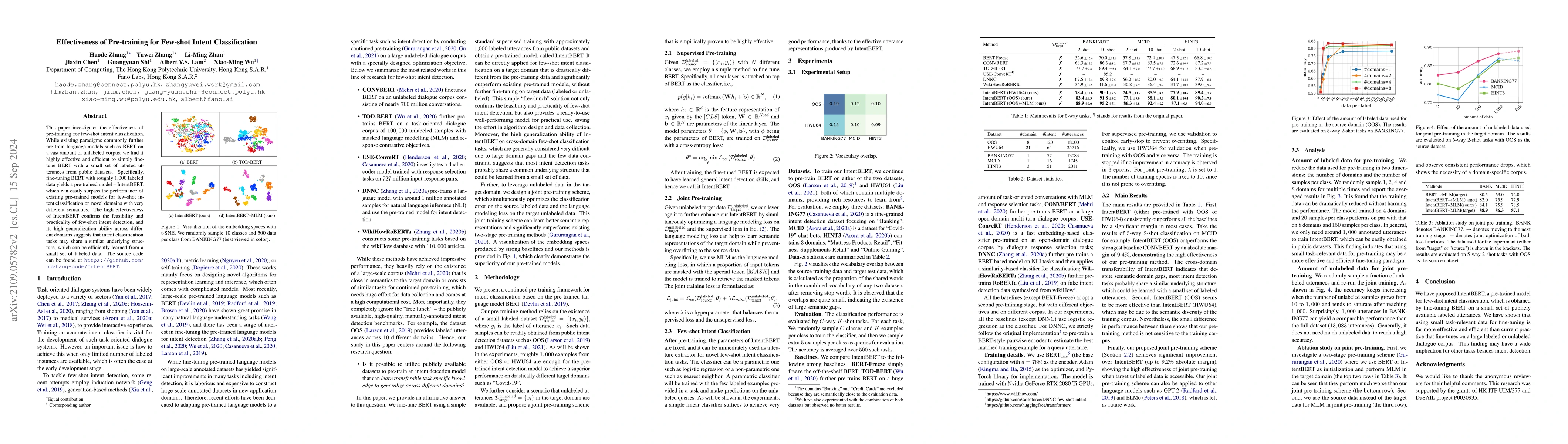 This paper demonstrates that fine-tuning BERT with a small set of labeled data (around 1,000 utterances) significantly outperforms existing pre-trained models for few-shot intent classification, suggesting a practical approach for few-shot intent detection. The model, named IntentBERT, shows high generalization across different domains.