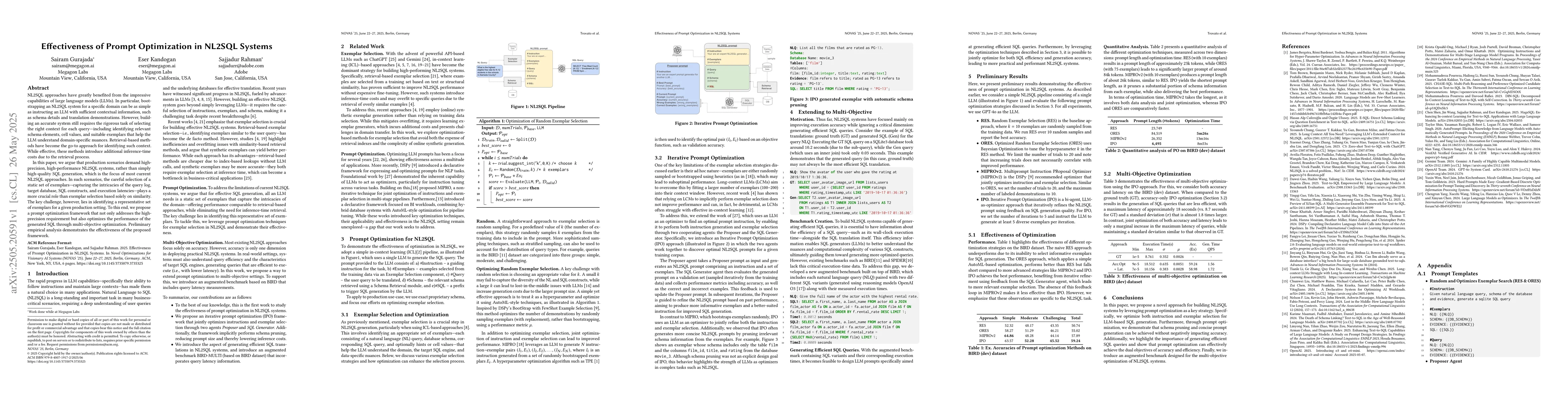 This paper introduces a prompt optimization framework for NL2SQL systems, emphasizing high-precision and performance in production scenarios. It argues against the current focus on high-quality SQL generation, proposing instead a method using a static set of exemplars representative of query logs, databases, SQL constructs, and execution latencies. Preliminary results show the effectiveness of this approach.