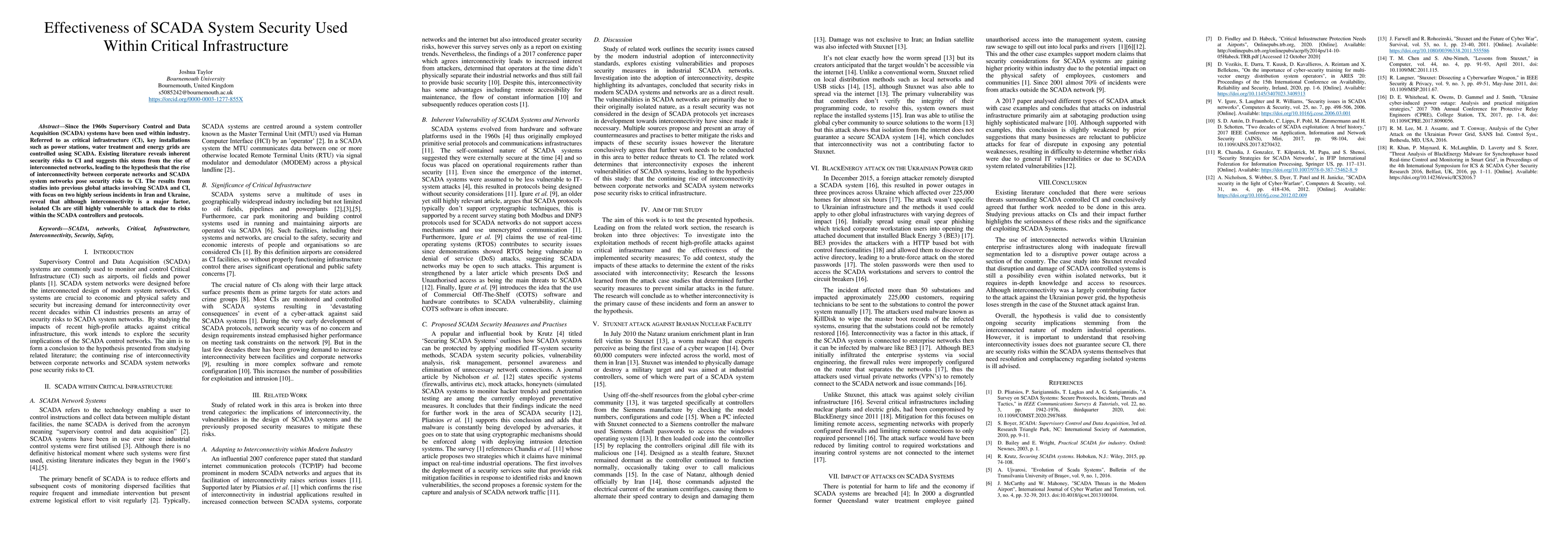 This paper examines the security risks inherent in SCADA systems used in critical infrastructure, highlighting that while interconnectivity poses significant threats, isolated systems remain vulnerable due to internal SCADA controller and protocol flaws, as evidenced by serious incidents in Iran and Ukraine.