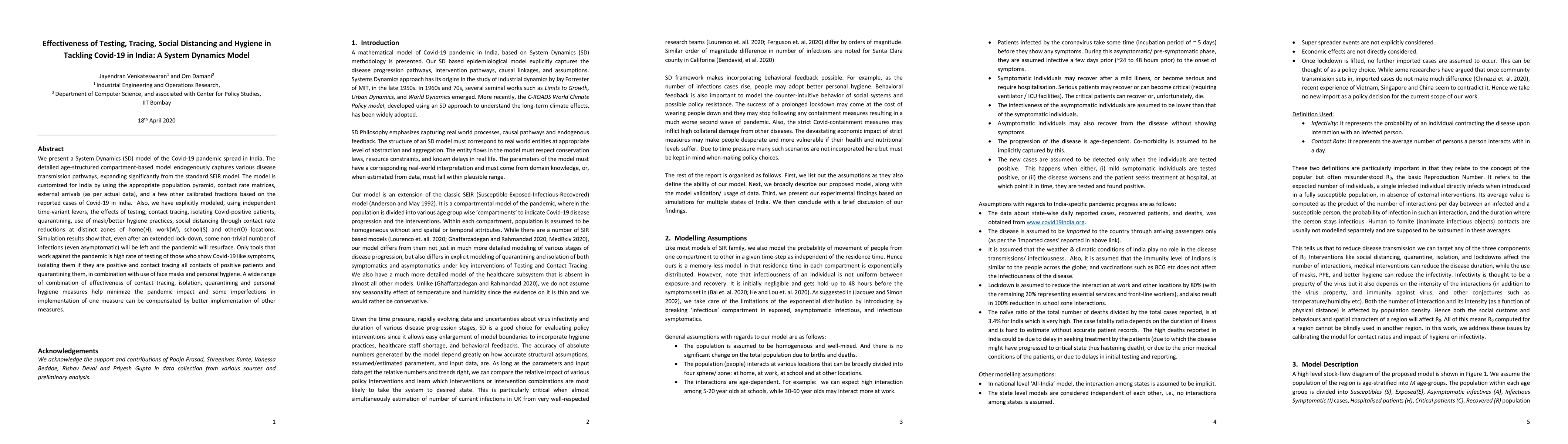 This paper uses a System Dynamics model to analyze Covid-19 transmission in India, highlighting the effectiveness of testing, tracing, isolation, quarantine, and hygiene practices. The study finds that while extended lockdowns may reduce infections, a combination of high-rate testing, contact tracing, and personal hygiene is crucial to mitigate the pandemic's impact.