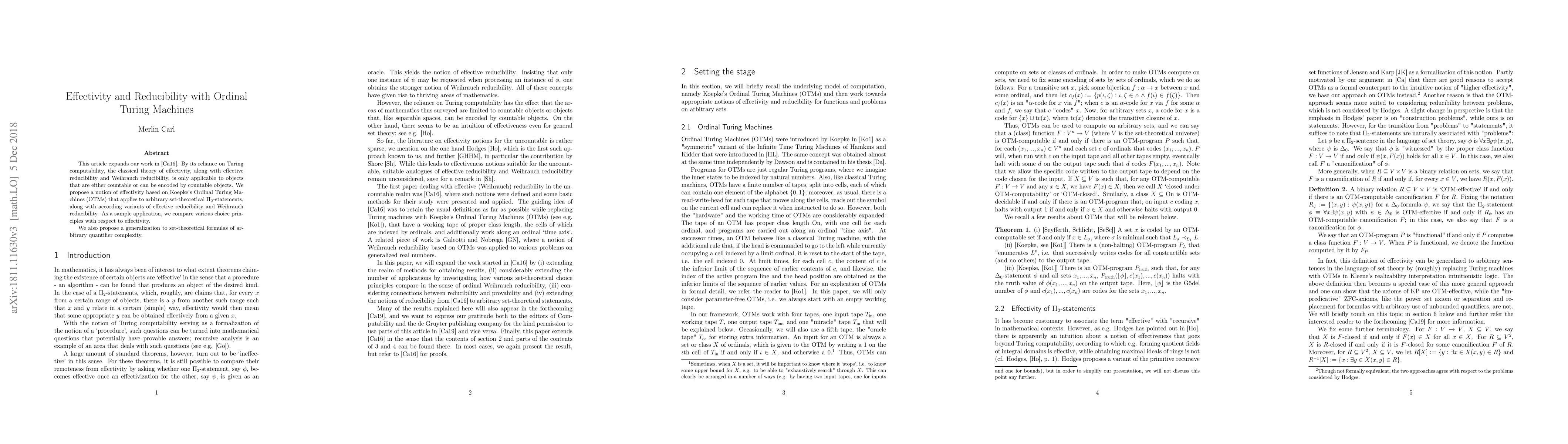 The paper introduces ordinal Turing machines (OTMs) to extend the classical theory of effectivity, allowing for the analysis of set-theoretical $\Pi_{2}$-statements and their reducibility.