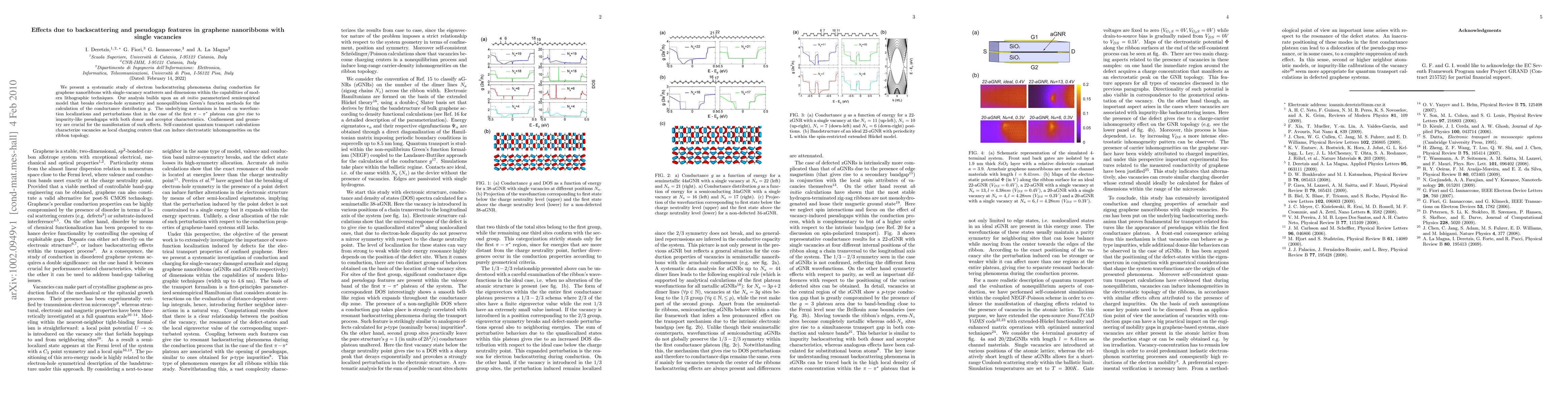 This study investigates electron backscattering and pseudogap features in graphene nanoribbons with single vacancies using an \textit{ab initio} model and nonequilibrium Green's function methods. The research reveals that vacancies can induce pseudogaps and electrostatic inhomogeneities, significantly affecting the conductance distribution.