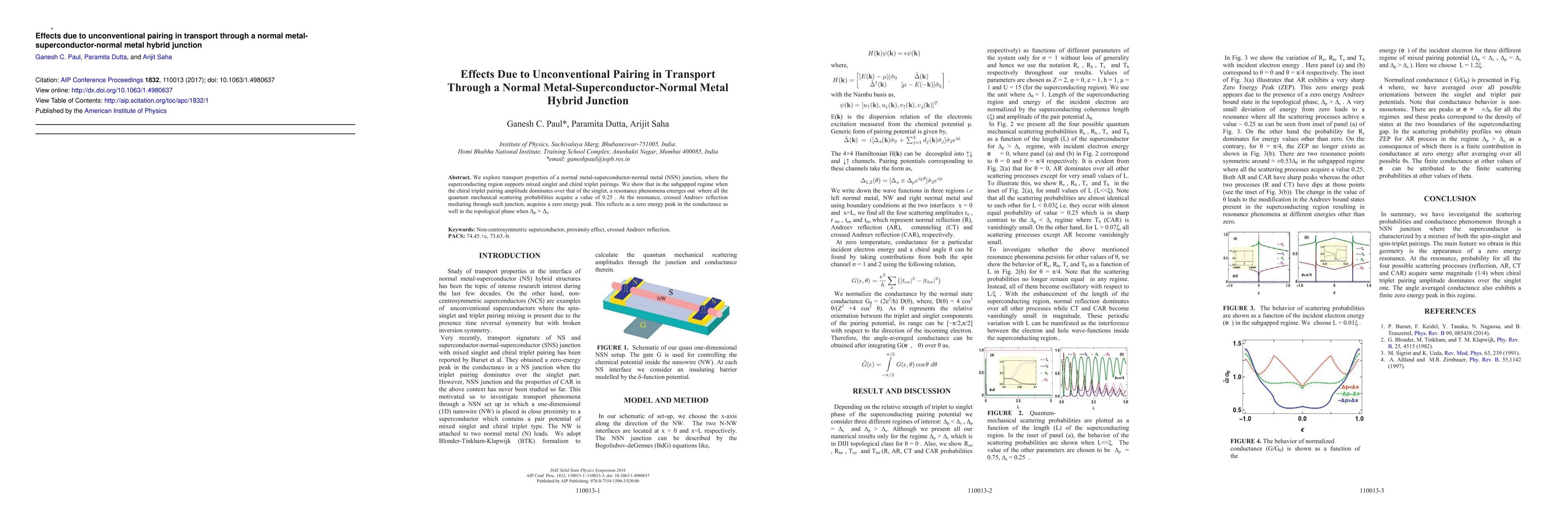 The paper presents a detailed theoretical analysis of transport through a normal metal-superconductor-normal metal hybrid junction with mixed singlet and chiral triplet pairing, identifying a resonance phenomenon leading to a zero-energy peak in conductance.