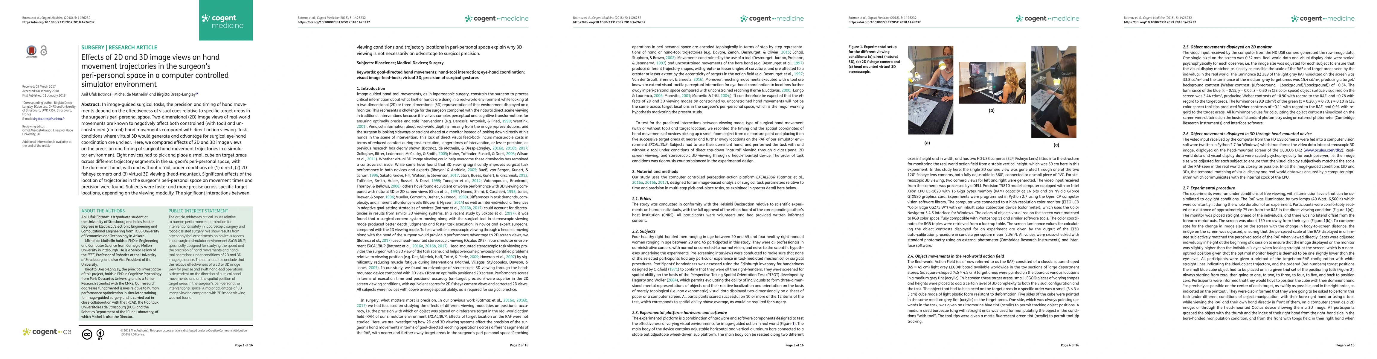 This study examines how 2D and 3D image views affect the precision and timing of hand movements in a computer-controlled surgical simulator. Results show that both novices with and without tools performed faster and more precisely in specific peri-personal space locations when using 3D virtual views compared to 2D fisheye camera views.
